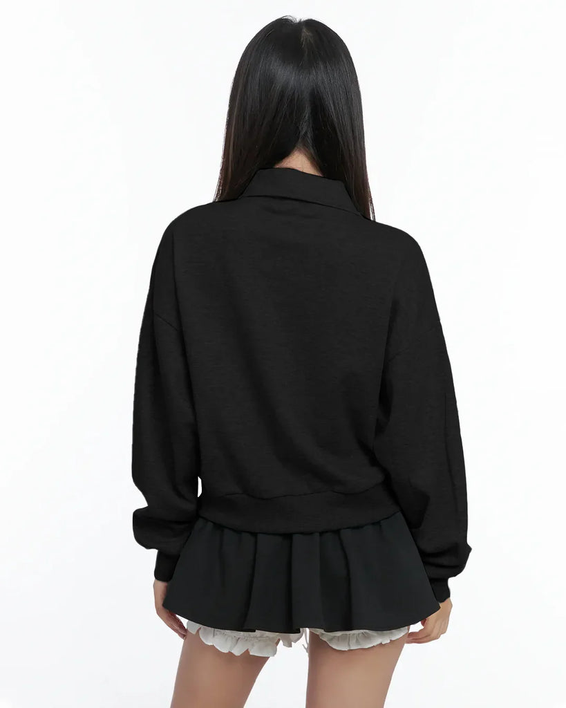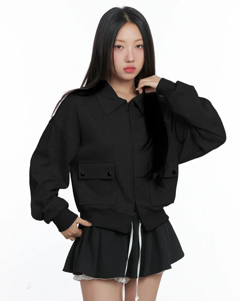 Black Zip Up Collar Long Sleeve Jacket with Front Pockets