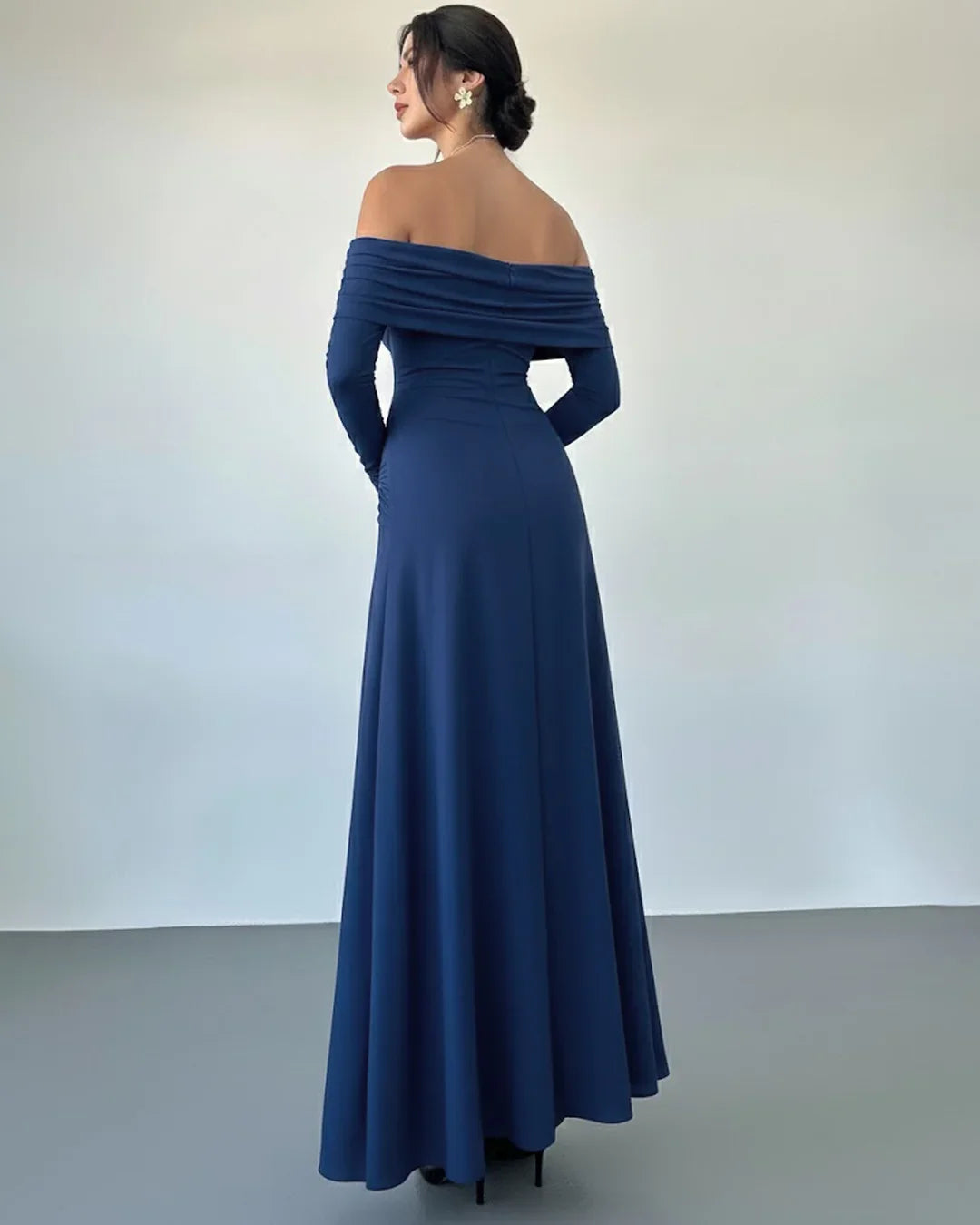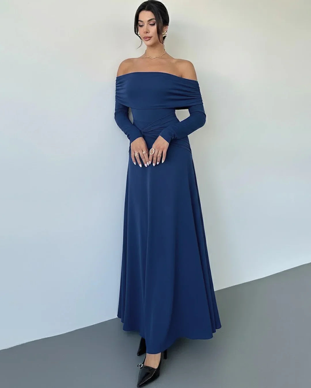 This maxi dress is all about soft drama and effortless elegance. Designed with an off-shoulder neckline, it highlights the shoulders beautifully while keeping the look graceful and balanced. The ruched waist with a subtle twist detail defines your shape, and the A-line silhouette flows comfortably, making it easy to wear for long hours.