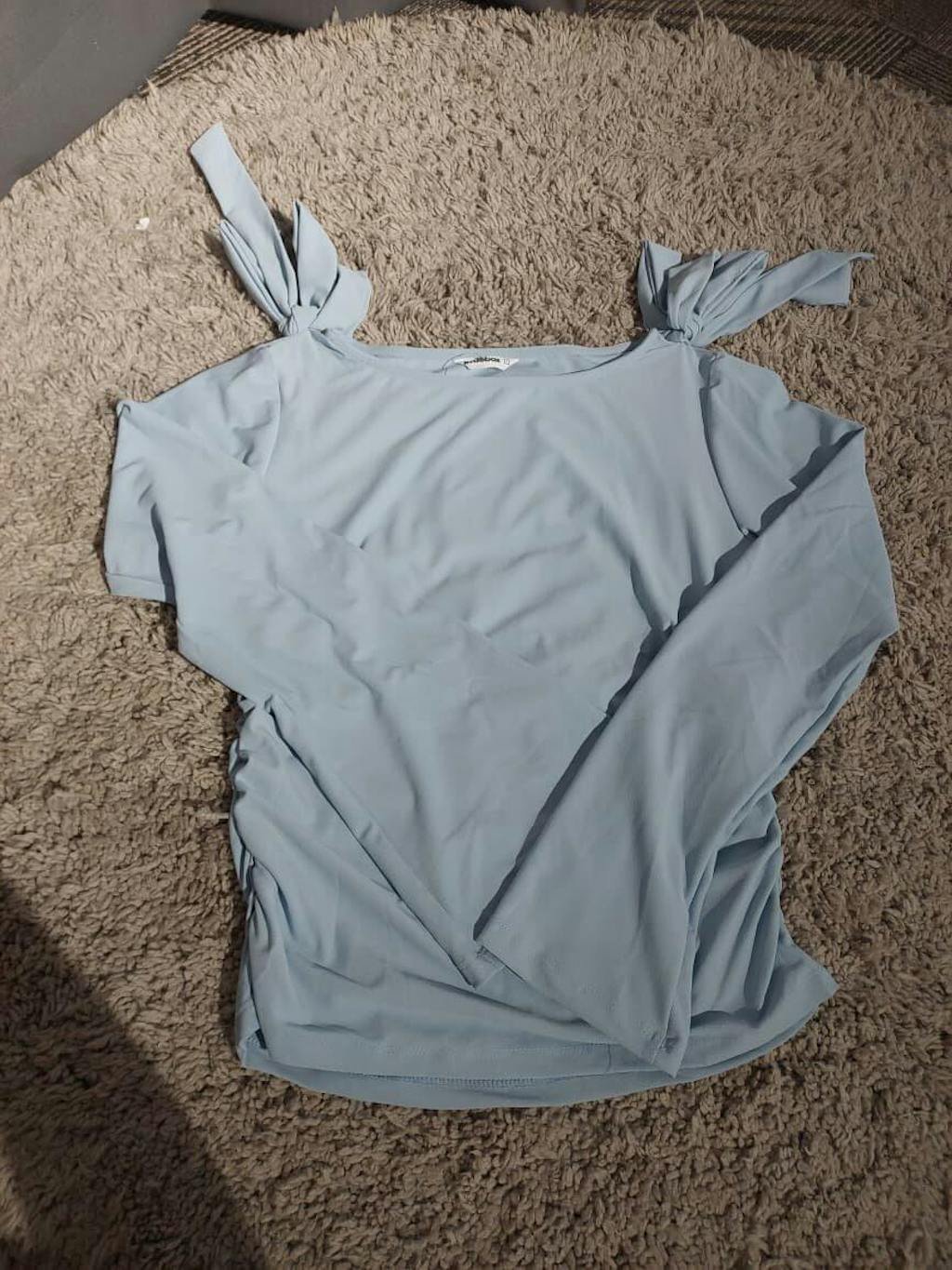 This bow tops for women style brings a soft, feminine look with a clean, modern shape. Designed with a wide neckline and statement bow ties at the shoulders, it adds a playful touch while keeping the fit neat and flattering. The fitted bodice hugs comfortably around the waist, and the gentle ruching through the midsection adds subtle texture without feeling bulky. Long flared sleeves balance the cropped length, giving the silhouette an easy flow. Finished in a calm blue tone, this bow tops for women piece feels fresh, stylish, and easy to wear. Crafted in a smooth stretch blend, it stays comfortable and flexible through long hours.