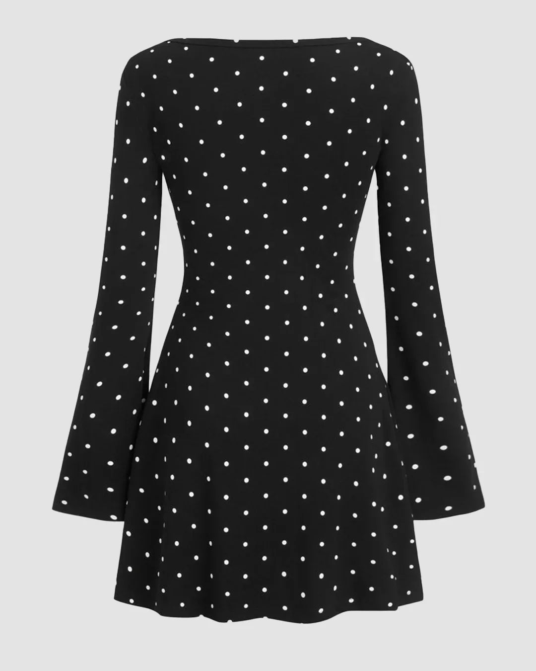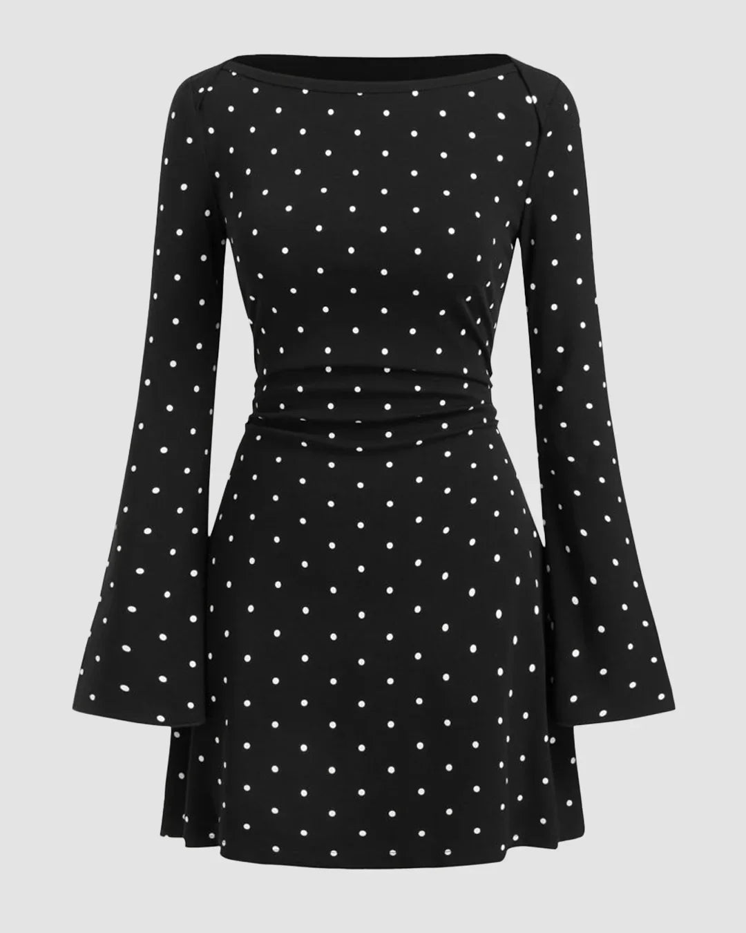 Boat Neck Polka Dot Ruched Bell Sleeve Mini Dress