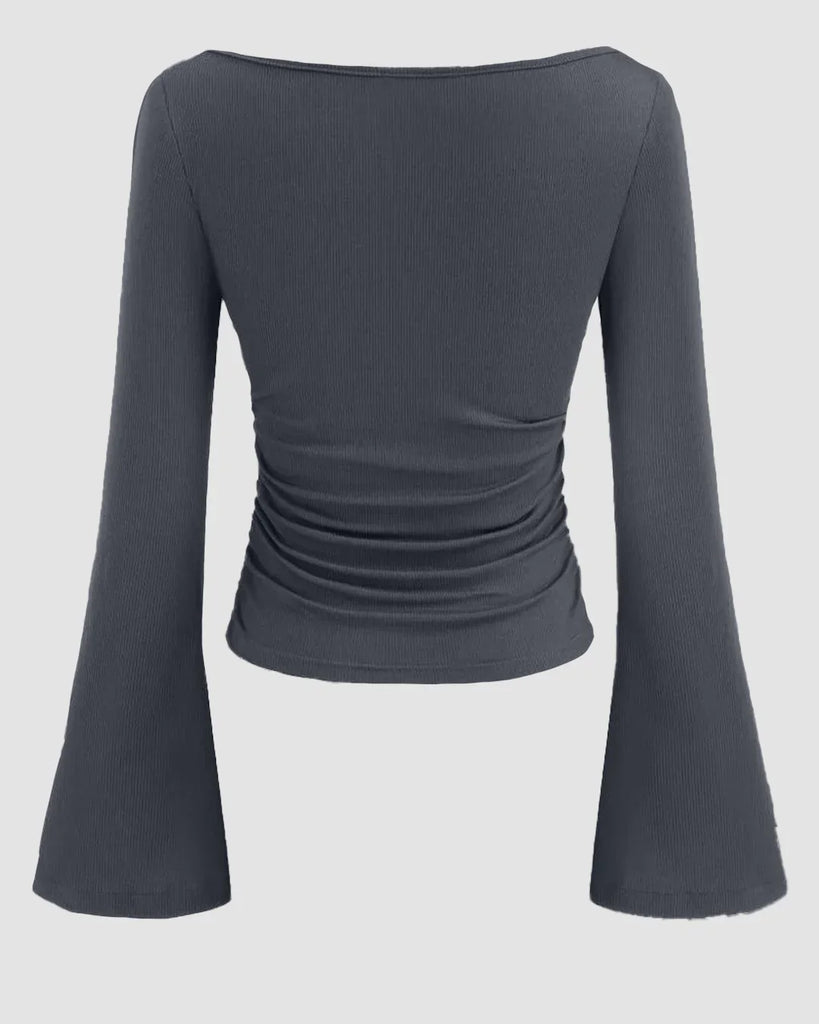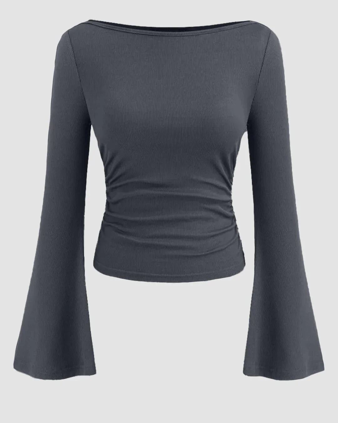 Boat Neck Solid Ruched Long Sleeve Top in Dark Grey brings together sleek minimalism and subtle drama. With its wide boat neckline, fitted silhouette, and flared sleeves, this ruched top gives an elevated twist to everyday wear. The dark grey tone makes it easy to style, giving both casual and evening outfits a polished edge.