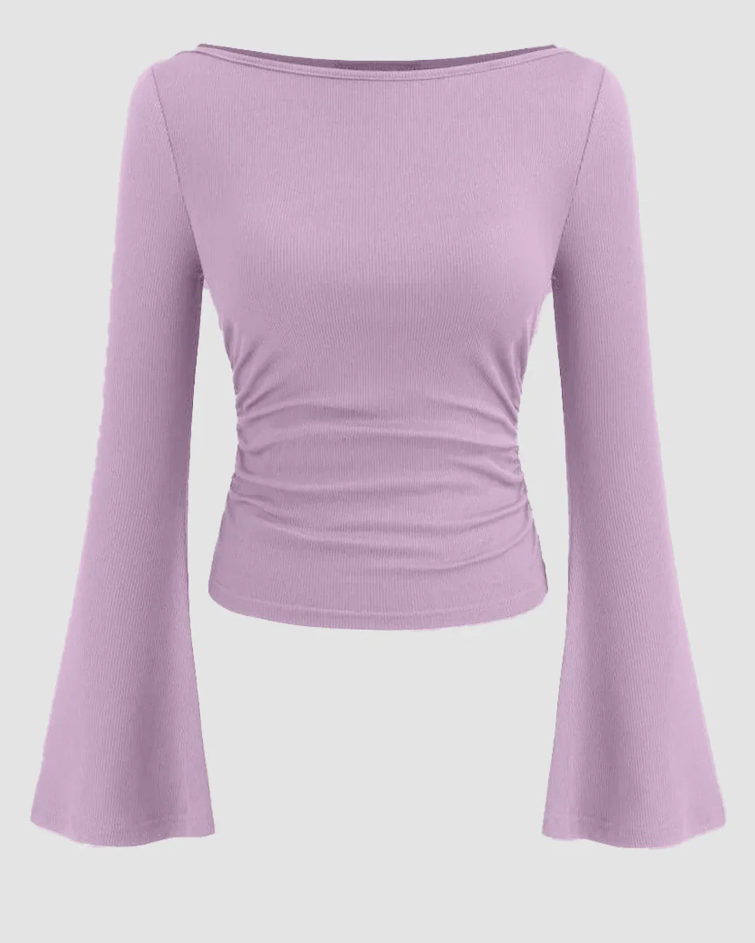 Boat Neck Solid Ruched Long Sleeve Top in Lilac