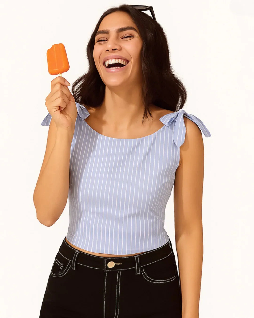Introducing our Boat Neckline Striped Bowknot Ruched Tank Top