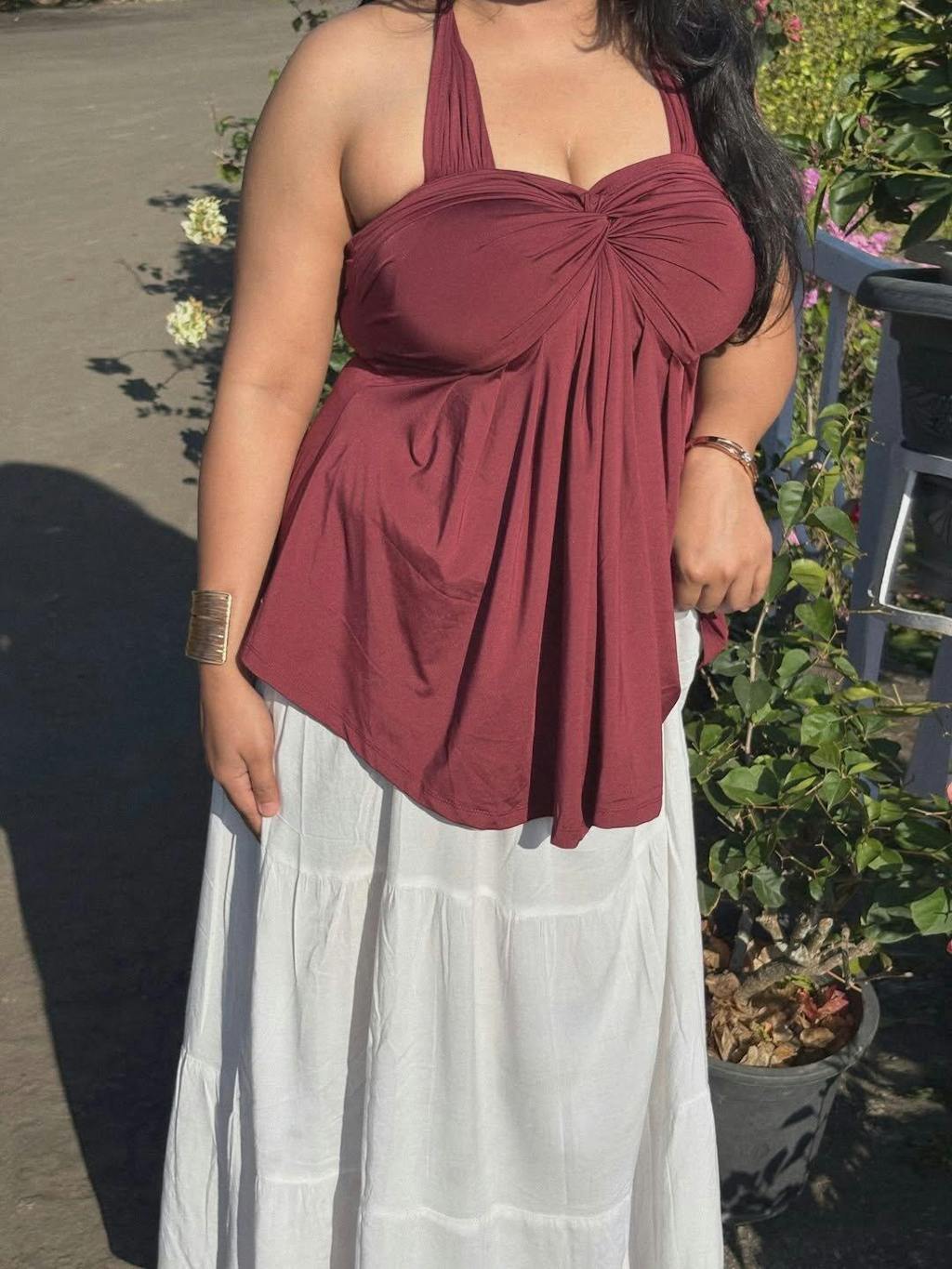 Brown Twist Front Draped Halter Top is a statement piece with a soft, flowy drape and flattering twist-front detail. This brown top is designed with a halter neckline that ties behind the neck, creating an effortlessly chic look for casual days or elevated evenings. The relaxed fit allows movement while still offering a feminine silhouette.