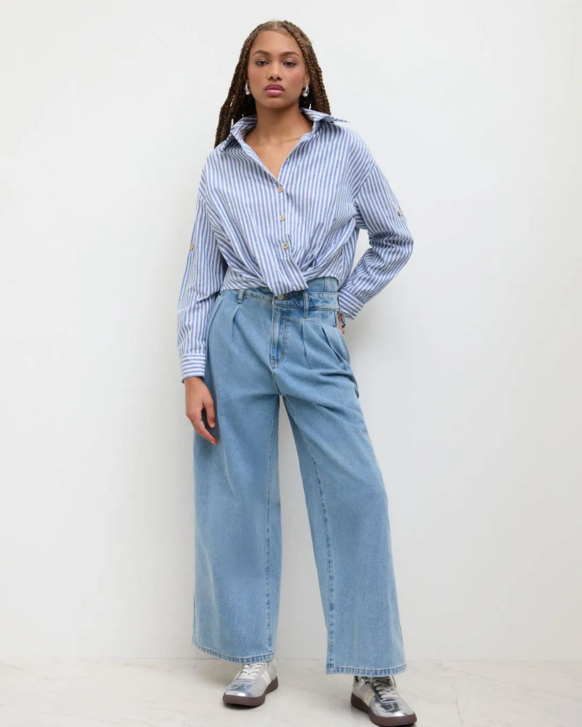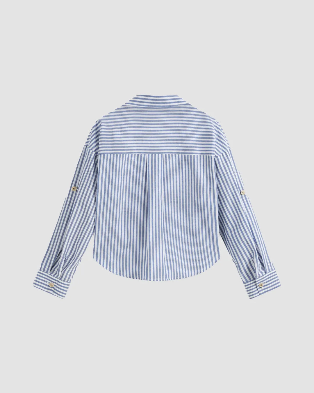 Introducing our Casual Collared Shirt with Front Knot. This collared shirt brings laid-back charm with a tailored twist; think button-down energy with a cute, cinched-up upgrade. The blue stripe pattern gives it that effortlessly put-together look.