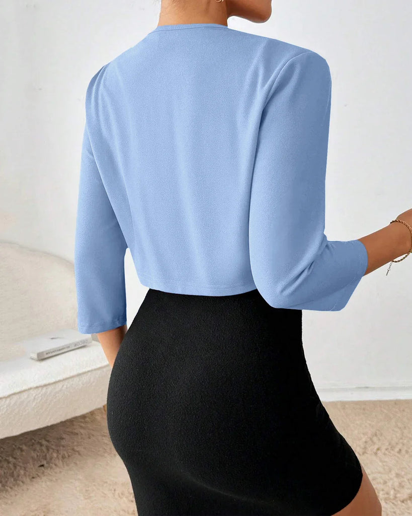 Cropped Open Front Structured Blazer Top in Rainwash is your shortcut to instant polish. With its clean open front, subtle pleats at the neckline, and cropped fit, this blazer top adds structure without sacrificing comfort. Perfect for layering over dresses, camis, or fitted tops, it’s a versatile piece that moves from desk to dinner with ease.