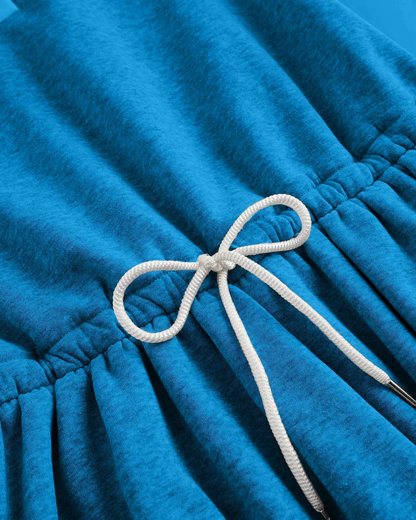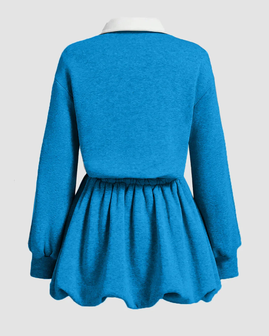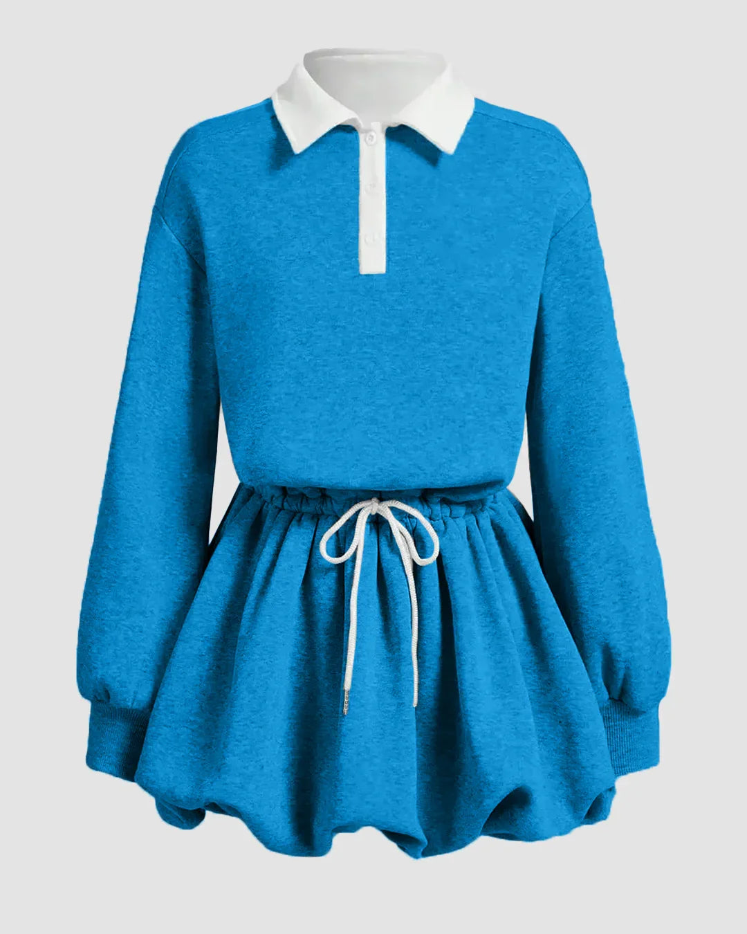 clectic Blue Sports Bud-Shaped Bubble Long-Sleeved Dress is a fresh take on sporty chic. With its relaxed fit, polo collar, and playful bubble hem, it balances athletic energy with fashion-forward design. The cinched waist with a drawstring tie flatters the figure while keeping comfort intact, making this long sleeve dress a bold everyday pick.