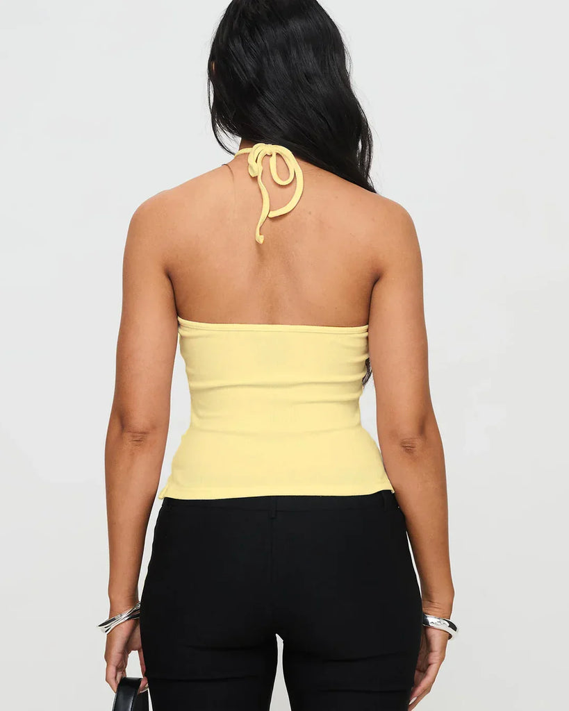 Bring playful elegance to your fits with this chic backless top in a soft vanilla shade. Designed with a halter neckline and open-back detail, it blends minimal style with bold energy. The knit texture adds subtle structure, making this backless top a versatile pick for everything from daytime outings to night plans.