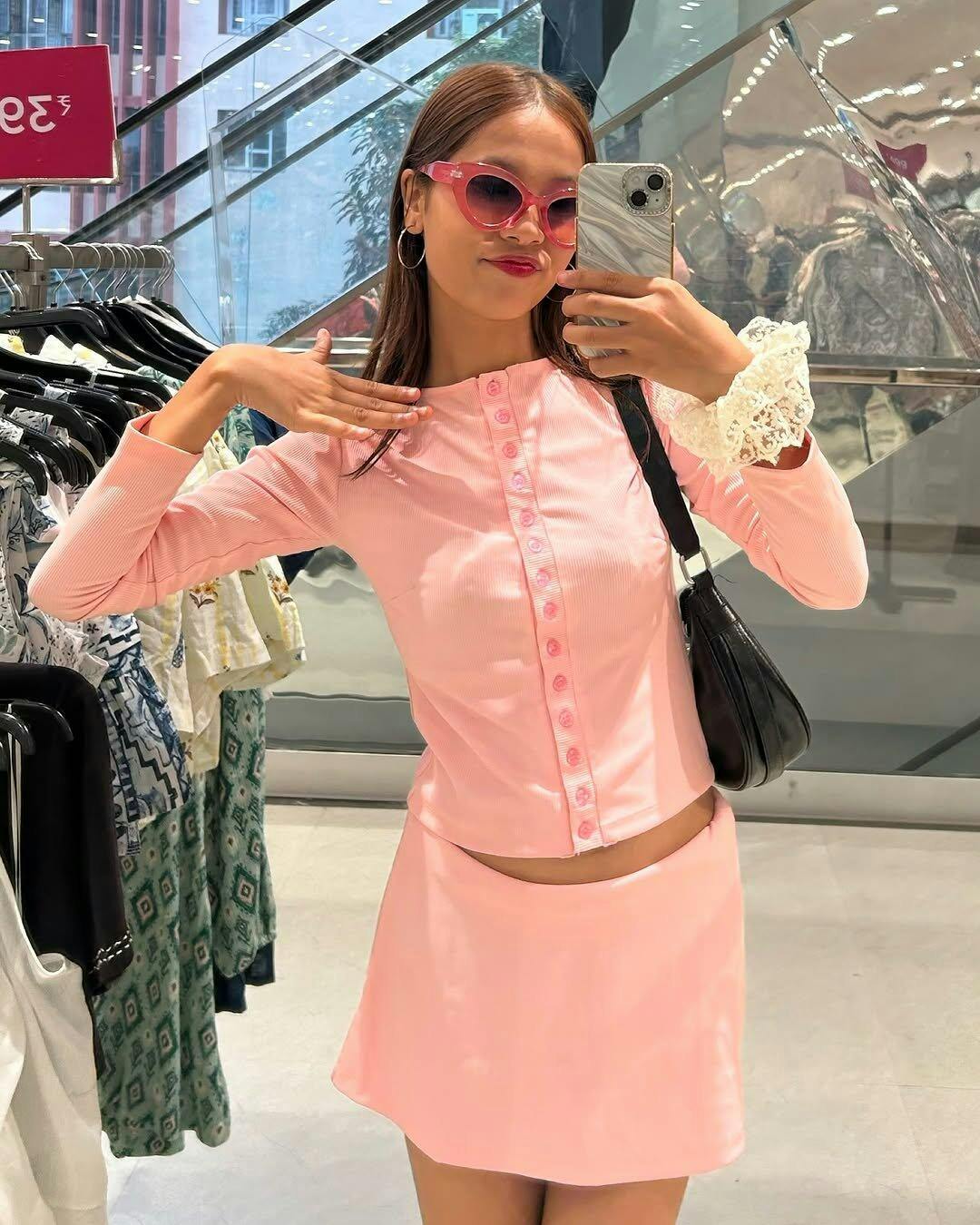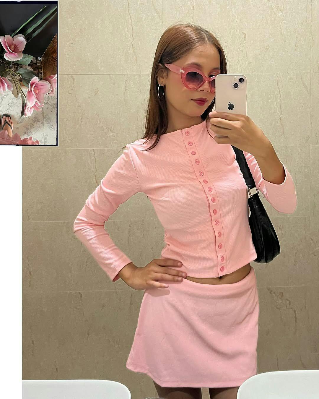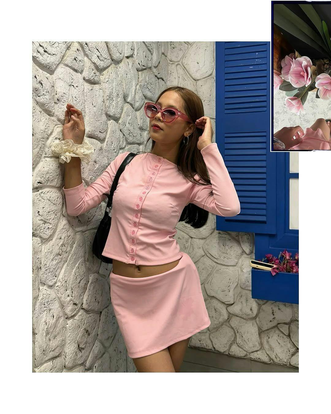 Introducing our Knit Fabric Button Up Top & Mid Rise Mini Skirt Set In Pink. This top and skirt set brings cozy-core meets soft glam. With a classic button-up knit cardigan and a perfectly fitted mini skirt, it’s made to keep things cute, coordinated, and comfy for everyday slay.