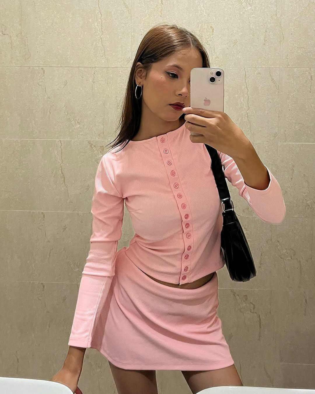 Knit Fabric Button Up Top & Mid Rise Mini Skirt Set In Pink