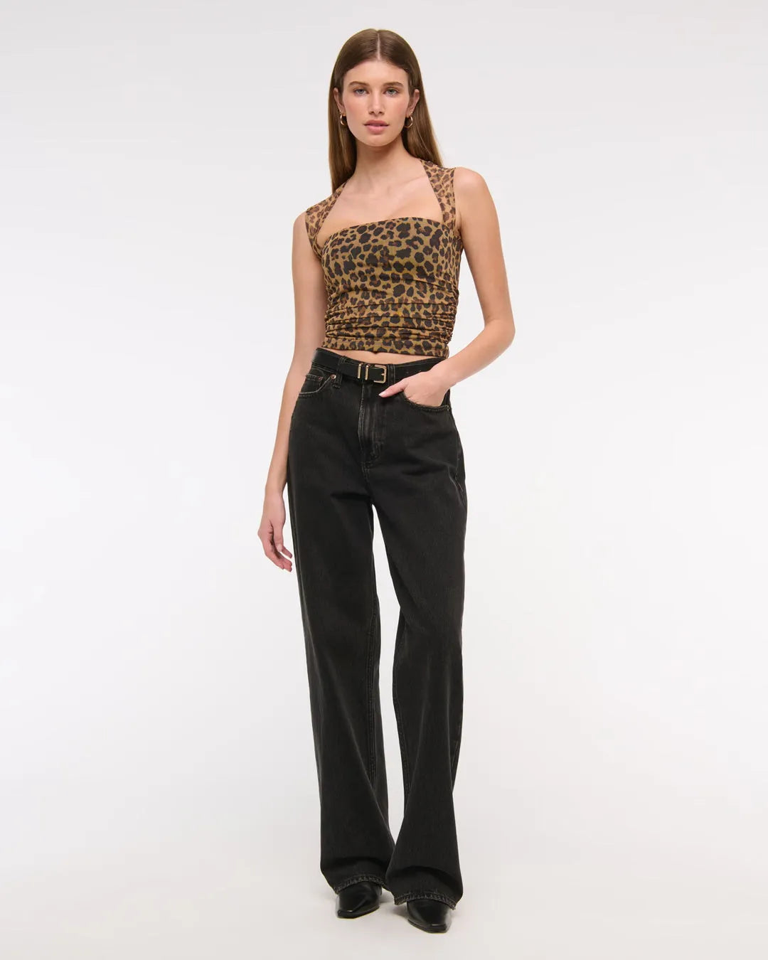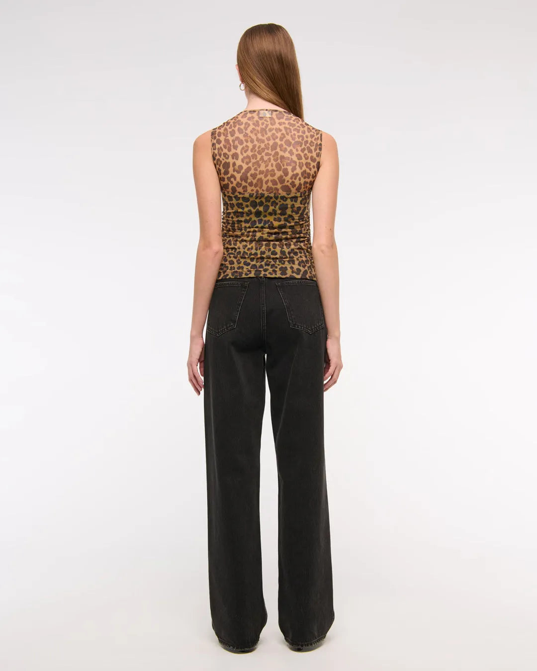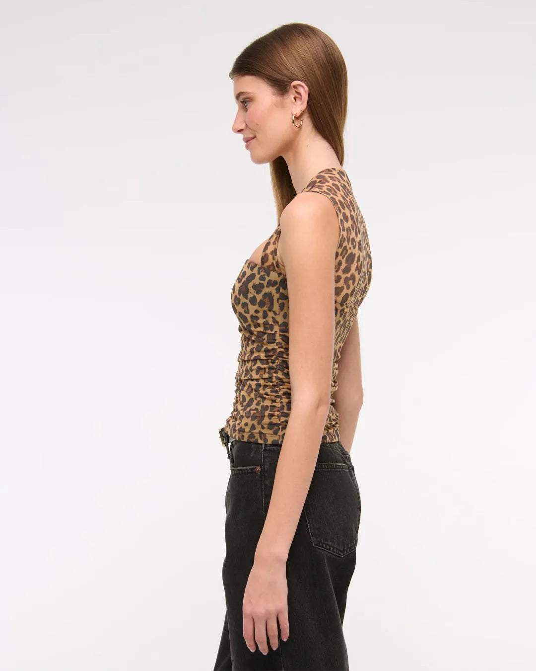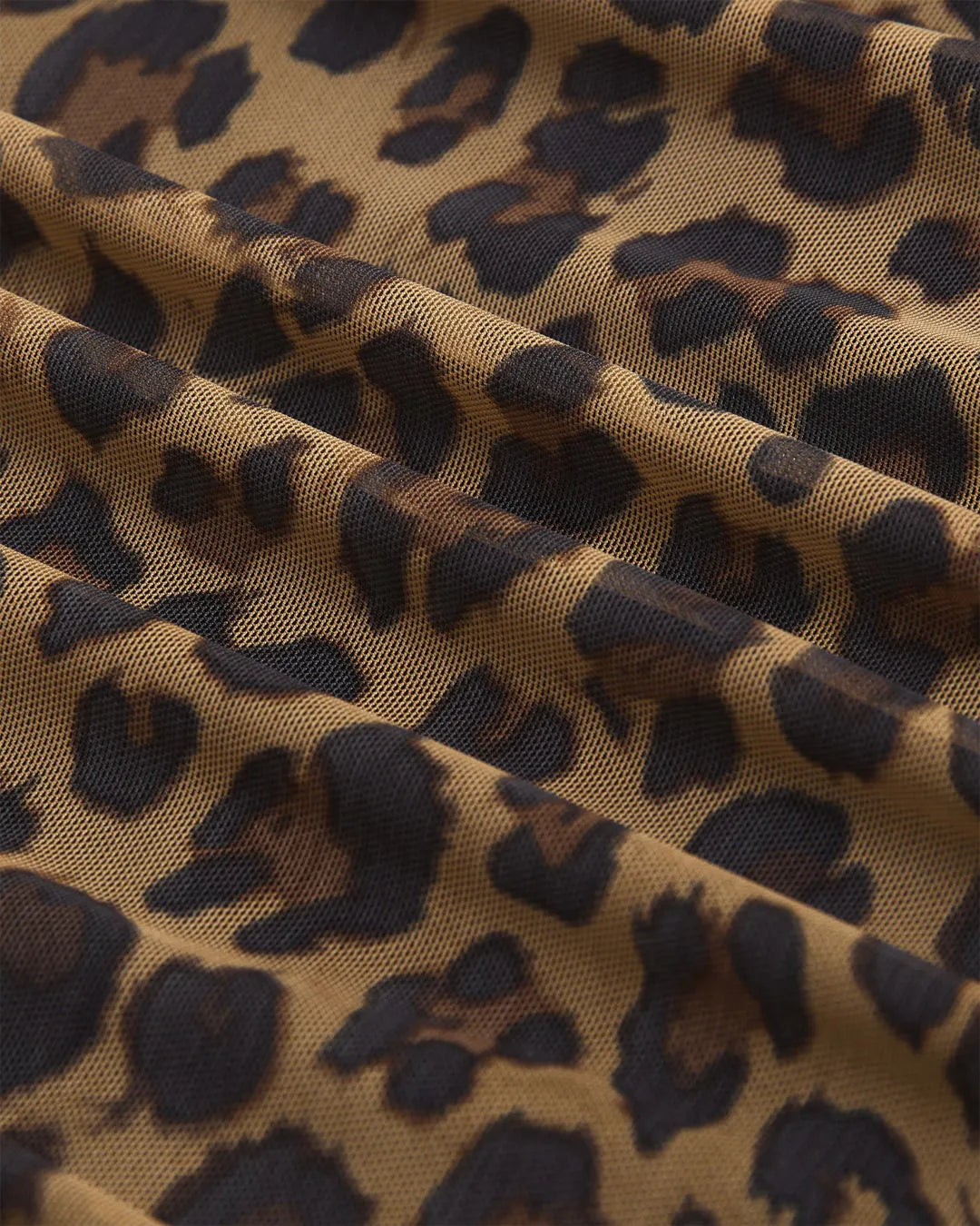Introducing our Leopard Print Mesh Panel Fitted Crop Top. This fitted crop top is all about bold attitude and sharp detail. Designed with a sheer mesh panel across the shoulders and an all-over leopard print, it delivers a curve-skimming fit that’s both sleek and statement-worthy. The stretch fabric ensures comfort while the ruched sides enhance your silhouette.