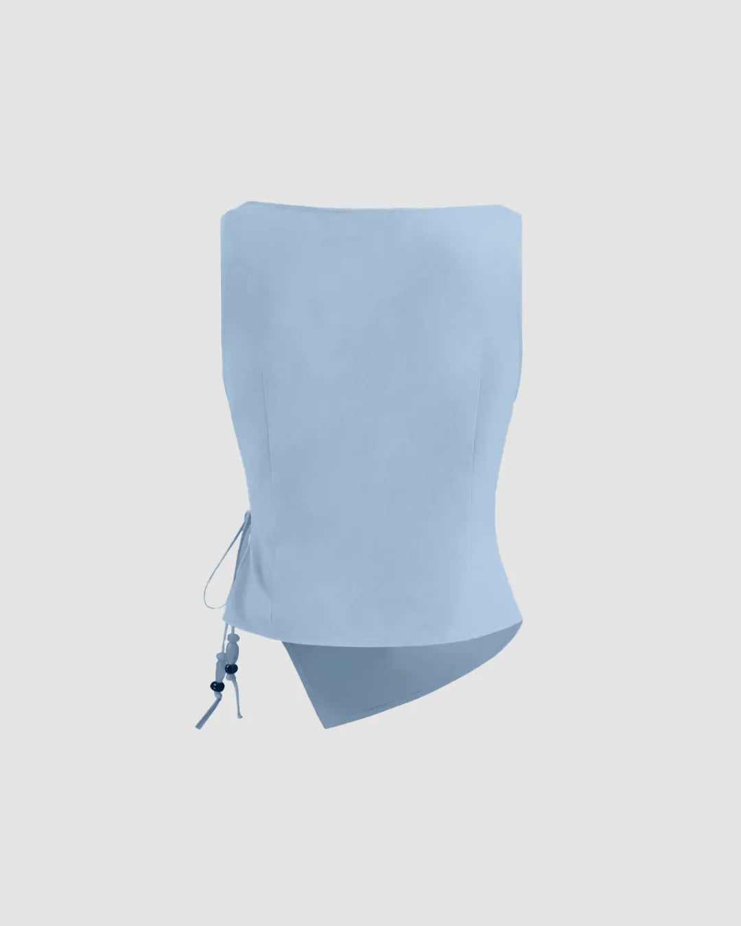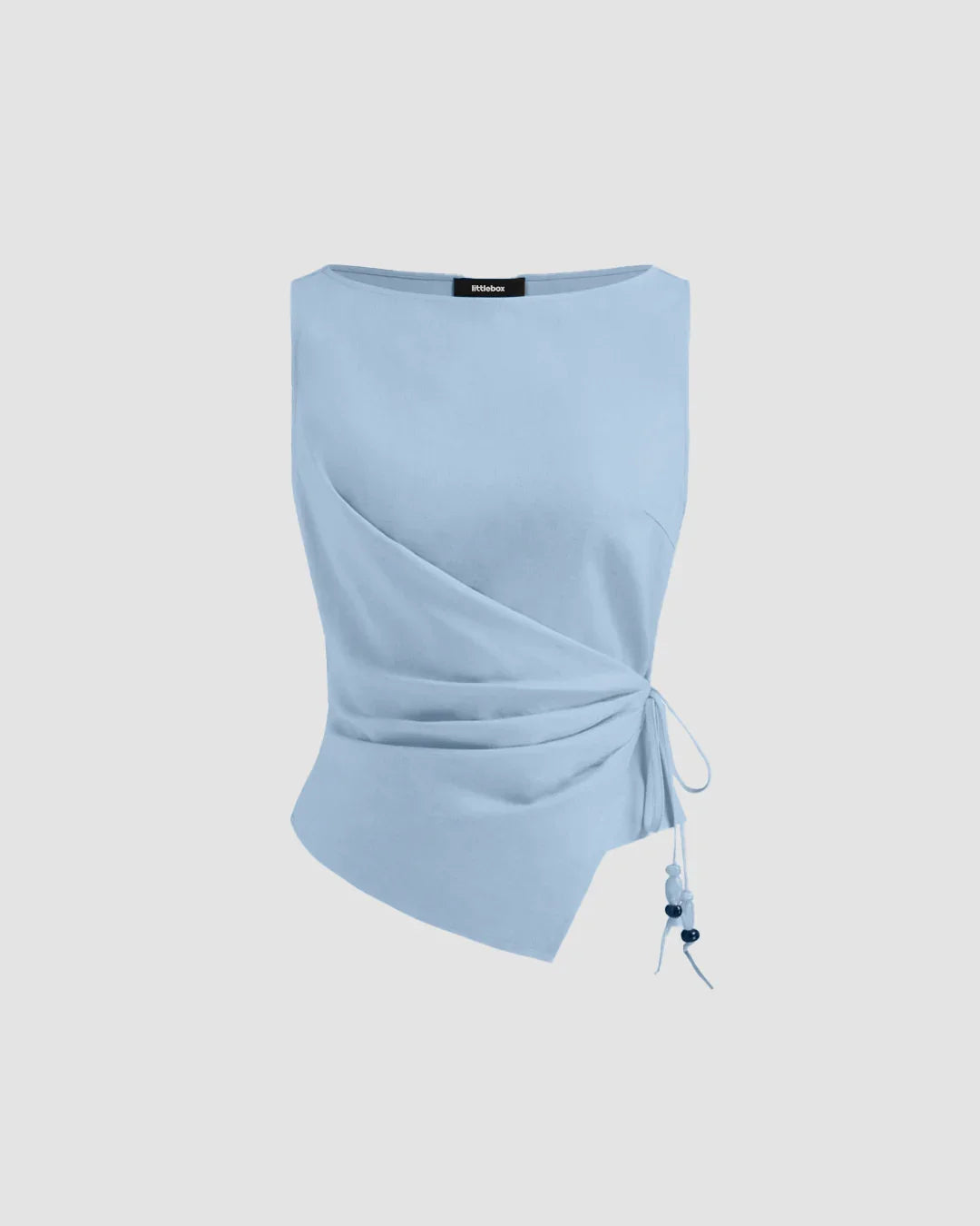 Light Blue Asymmetrical Ruched Side Tie Sleeveless Top brings a fresh twist to minimal style. With its asymmetric hem, side ruching, and tie detail with bead accents, this light blue top adds a playful yet polished vibe to your look. Perfect for sunny days or layering under a blazer, it’s a versatile piece your wardrobe will thank you for.