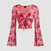 Lilac Solid Tie Front Bell Sleeve Mesh Crop Top