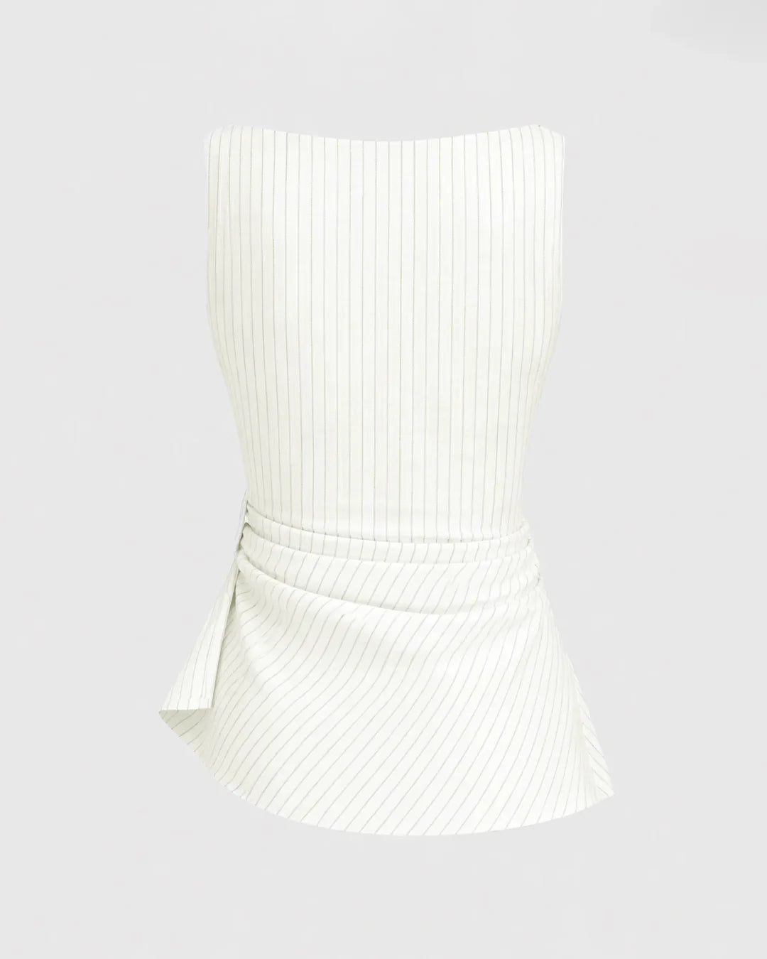 This linen-blend stripe boat neck tank top keeps things clean, easy, and effortlessly stylish. Designed with a soft boat neckline and subtle vertical stripes, it gives a flattering, lengthened look without trying too hard. The ruched detail at the side adds gentle shape, while the split hem keeps the silhouette relaxed and modern. Lightweight fabric makes this linen-blend stripe tank top breathable and easy to move in, perfect for everyday wear. It feels polished but still very laid-back, making it a solid go-to for warm days.