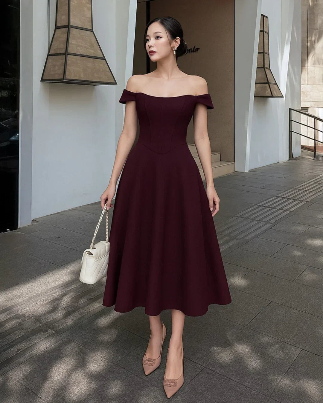 Introducing our Maroon Faux Fishbone Design Romantic One-Shoulder Dress. This one-shoulder dress is all about vintage drama with modern ease. Featuring a sculpted corset-inspired bodice and flared A-line hem, it hugs where it should and flows where it flatters.