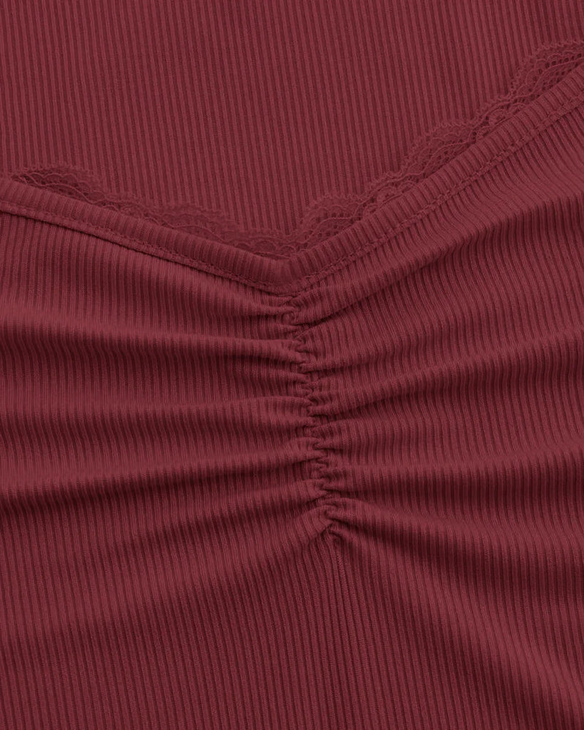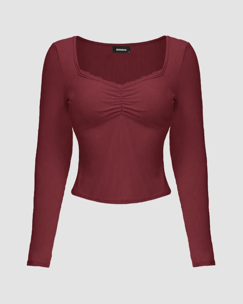 Maroon Ruched Front Mesh Full Sleeve Top is all about sleek lines and effortless confidence. With its ruched front detailing, square neckline, and slim fit, this maroon long sleeve crop top strikes the perfect balance between chic and casual. The cropped length pairs easily with high-waisted bottoms, making it a wardrobe essential for year-round styling.