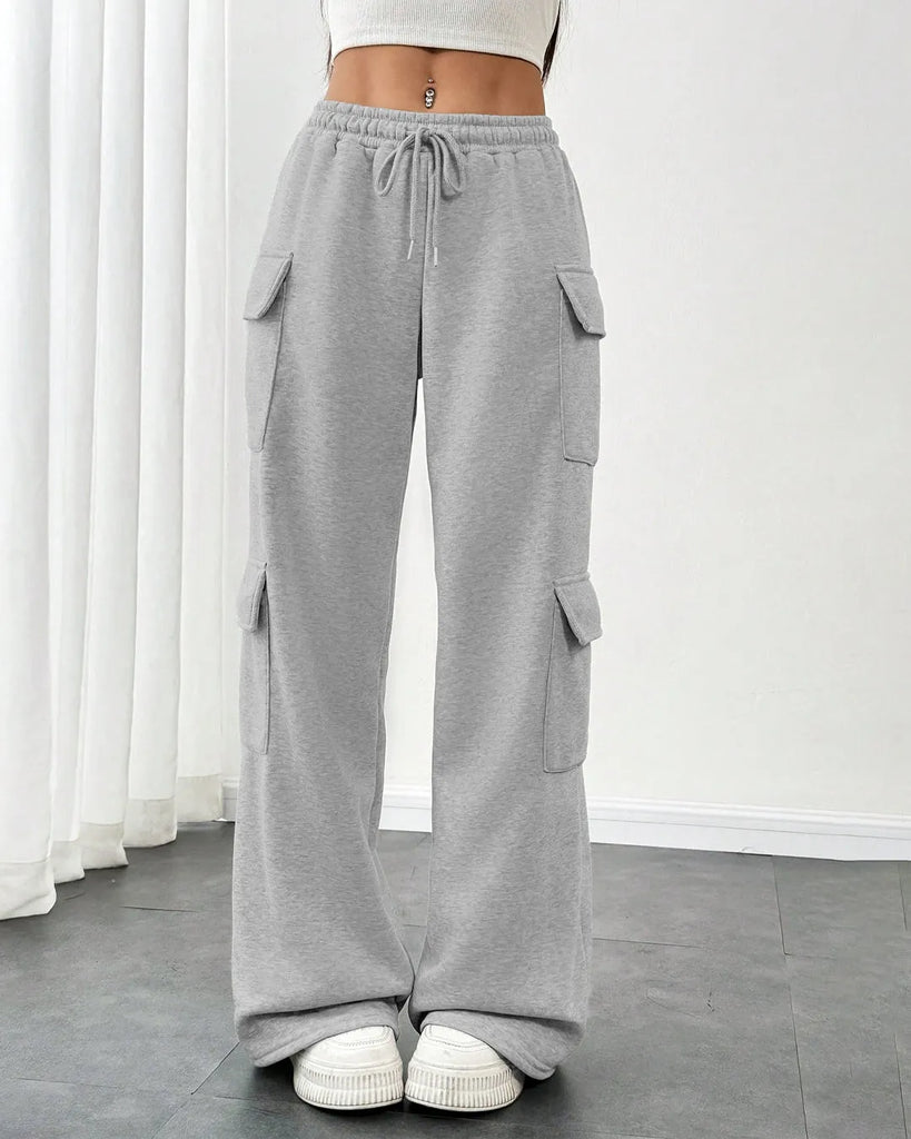 We are introducing the Melange Women's Cargo Trousers With Side Pockets and Drawstring Waist, a relaxed essential in the world of women's cargo trousers. Built for comfort but styled for anywhere, these grey trousers feature a soft elastic waistband and roomy flap pockets that take laid-back to the next level. Whether you're running errands, chilling indoors, or stepping out, these women's cargo trousers are your go-to.