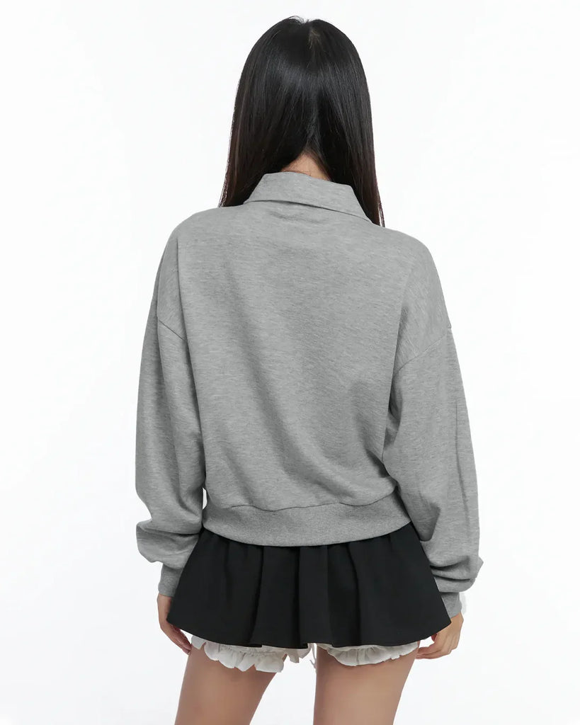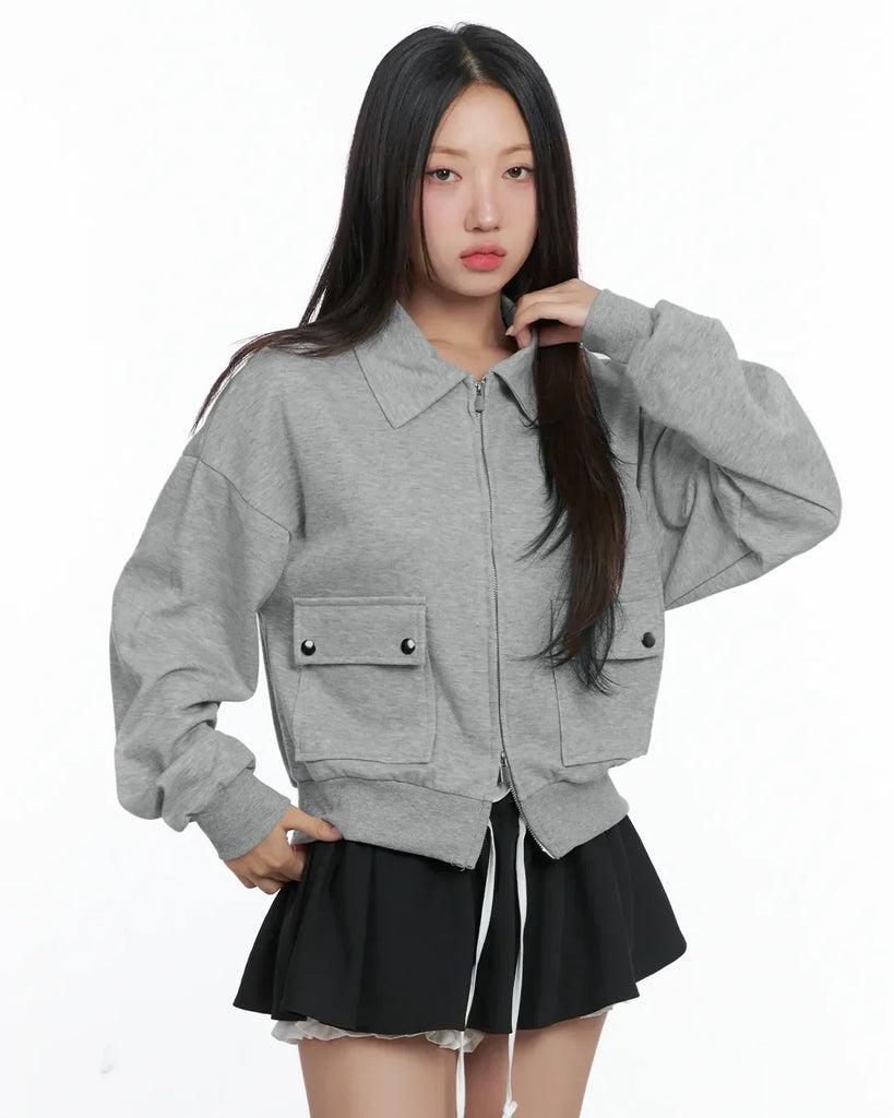 Mélange Zip Up Collar Long Sleeve Jacket with Front Pockets
