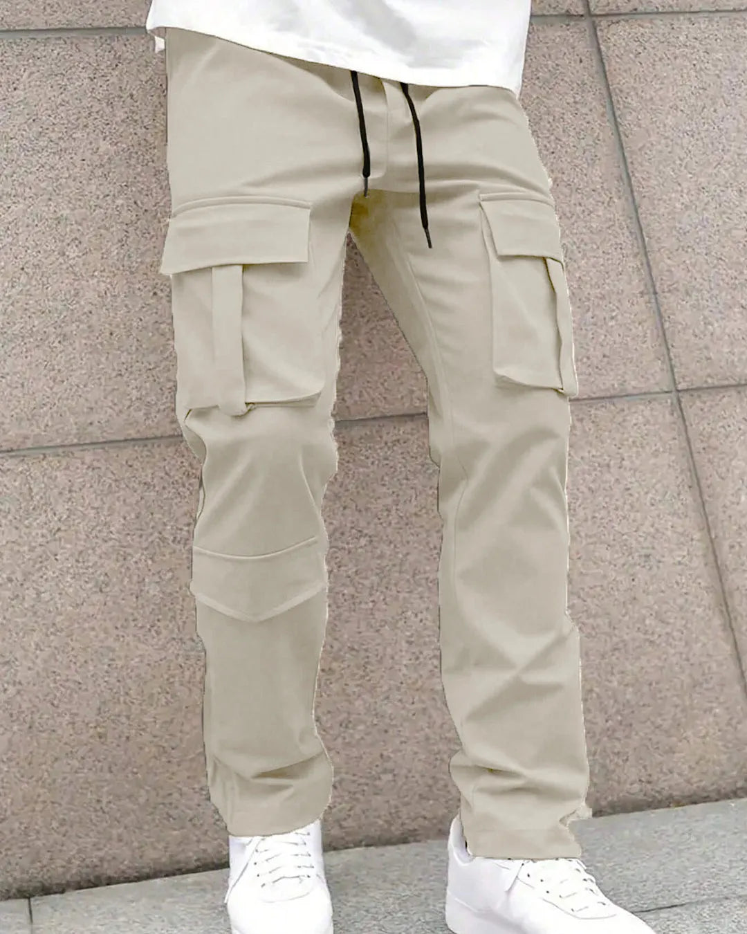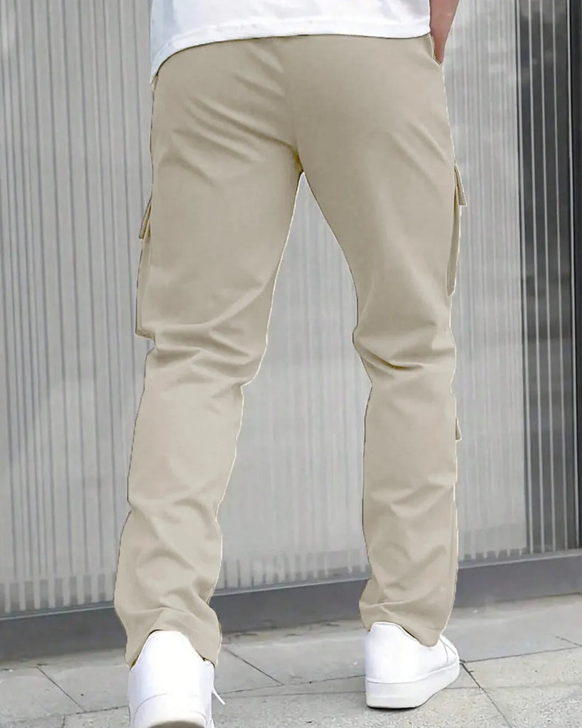Men Solid Color Front Tie Pocket Simple Casual Straight Leg Cargo Pants In Light Grey