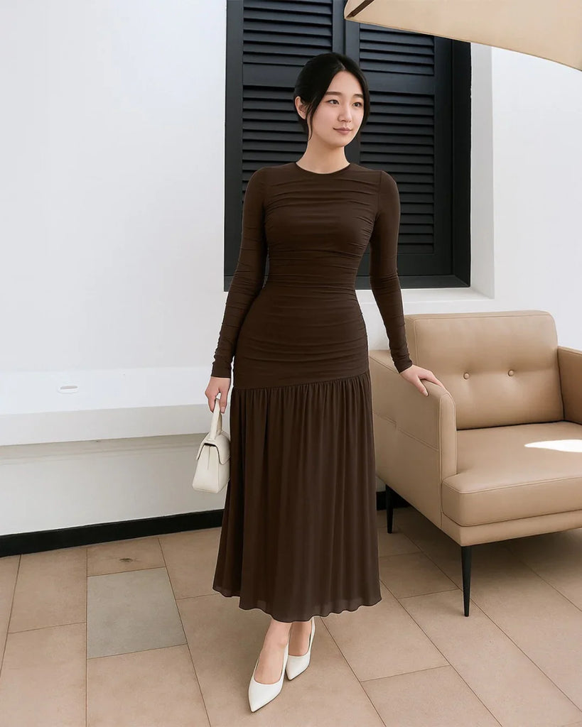 Mesh & Pleated Waist Cinched Long Sleeve Ruffled Coco Brown Dress