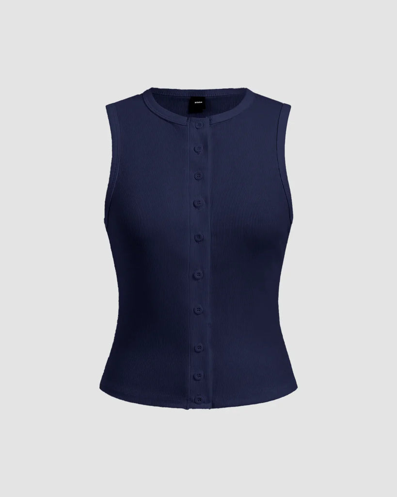 Navy Blue Ribbed Button-Down Sleeveless Top