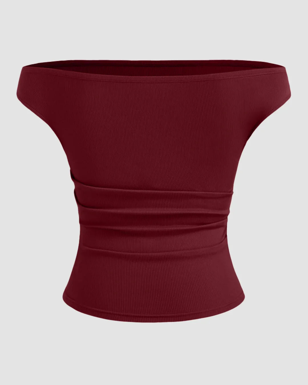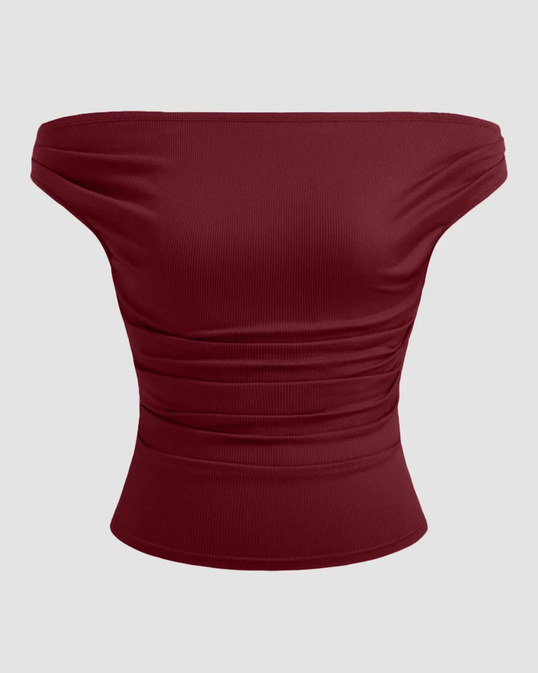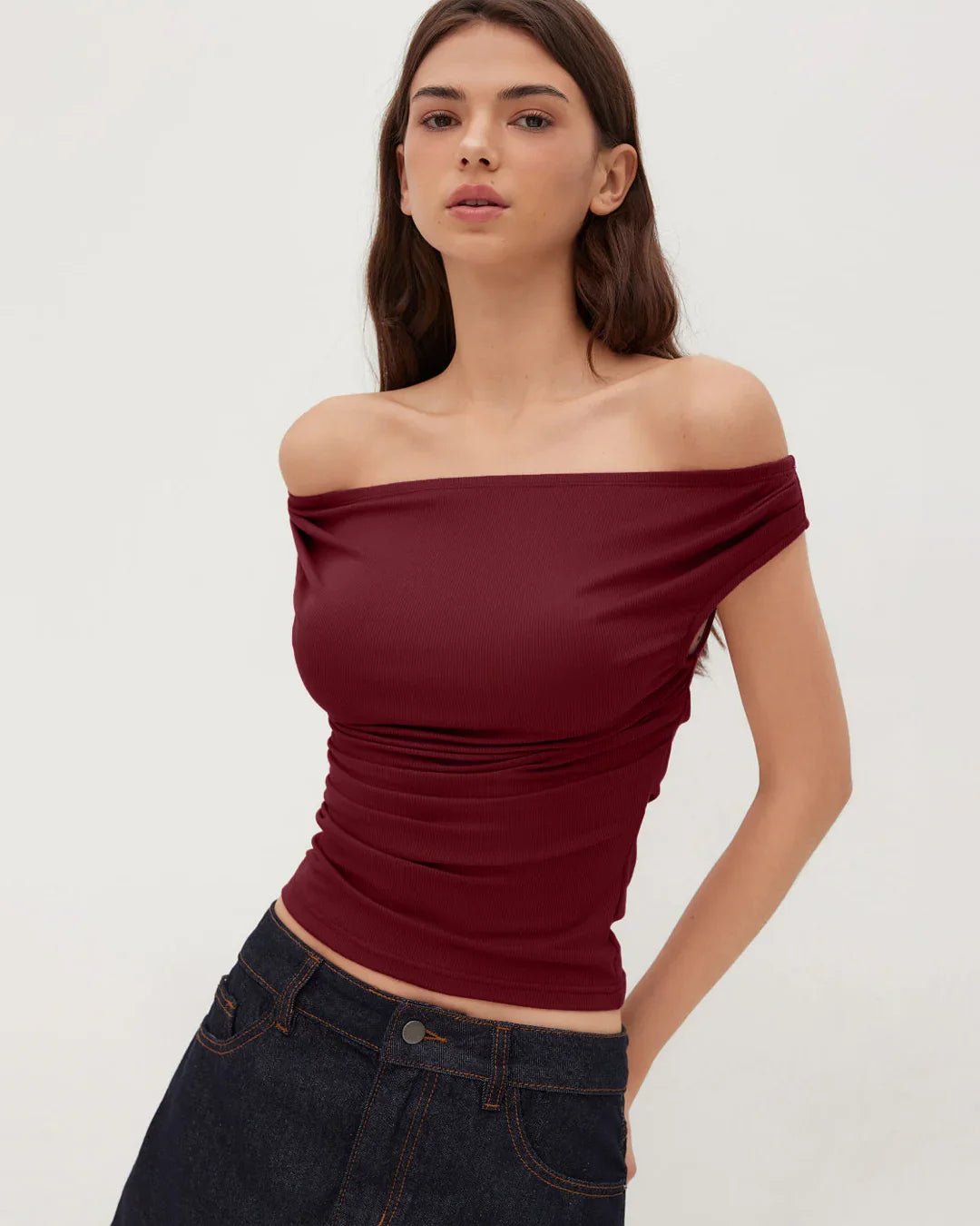 Off-Shoulder Ruched Short Sleeve Top in Maroon brings a clean, flattering silhouette with just the right hint of drama. Designed with an asymmetric off-shoulder neckline, this top highlights the collarbone while keeping the look soft and wearable. The ruched detailing through the waist creates a naturally cinched fit, giving shape without feeling tight. Finished with short sleeves and a straight hem, it’s an easy pick for both casual plans and dressed-up evenings.