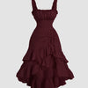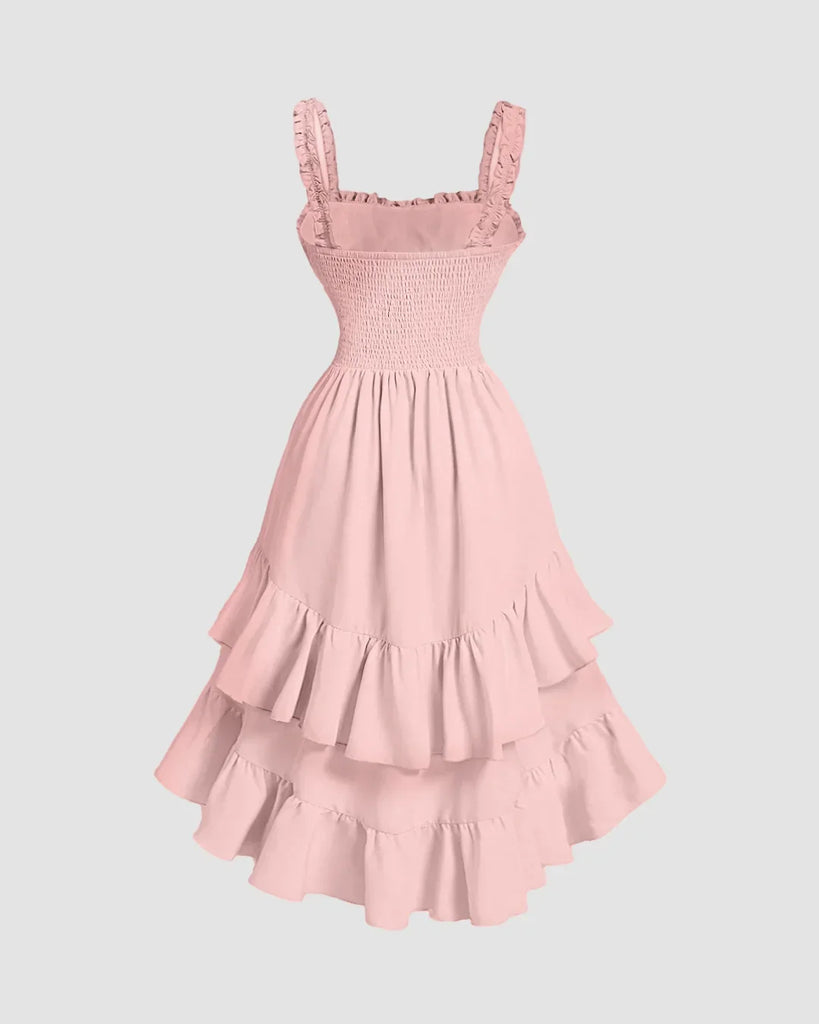Sweet and statement-worthy, our Powder Pink Ruched Square Neck Ruffle High-Low Midi Dress brings all the charm. With a ruched bodice, wide straps, and a cascading ruffle hem, this square neck midi dress is designed to turn heads effortlessly.