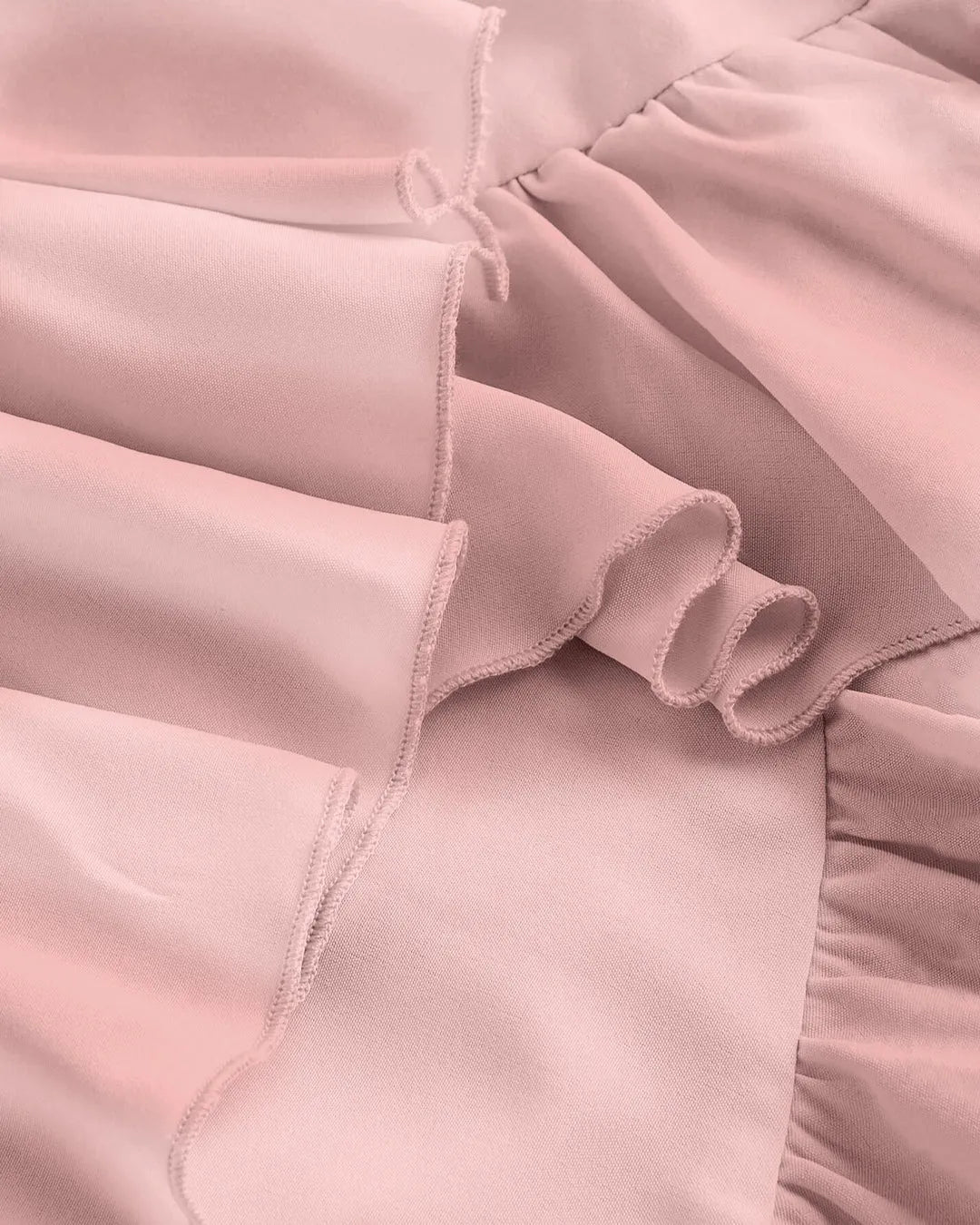 Powder Pink Ruched Square Neck Ruffle High-Low Midi Dress with Ruffle Hem