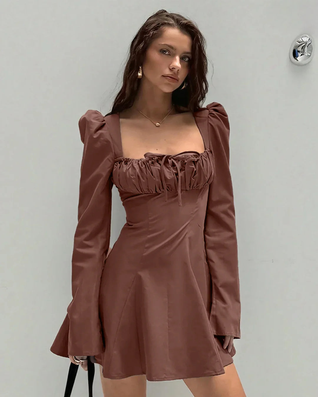 Ruched Bust Full Sleeve A-Line Mini Dress in Brown