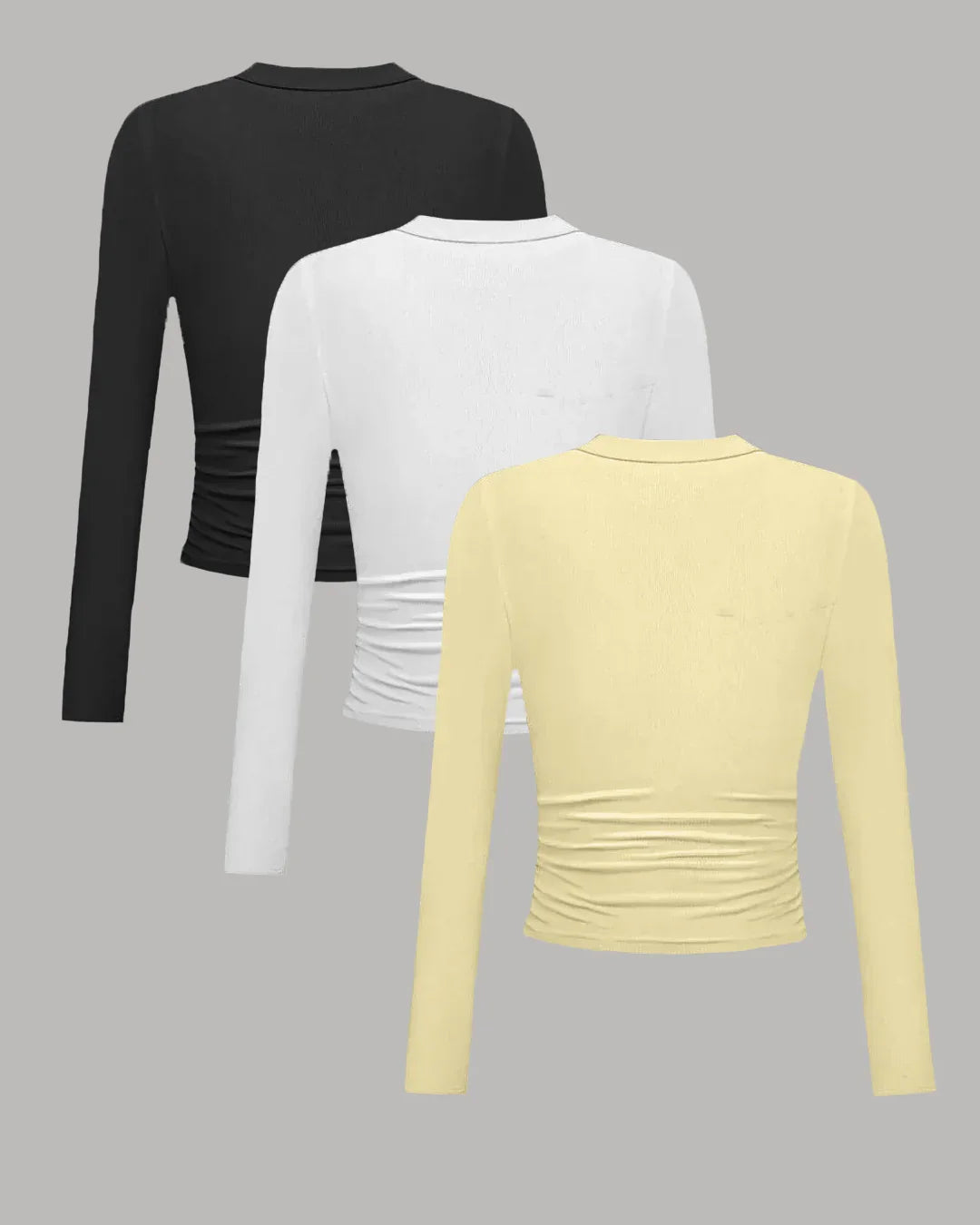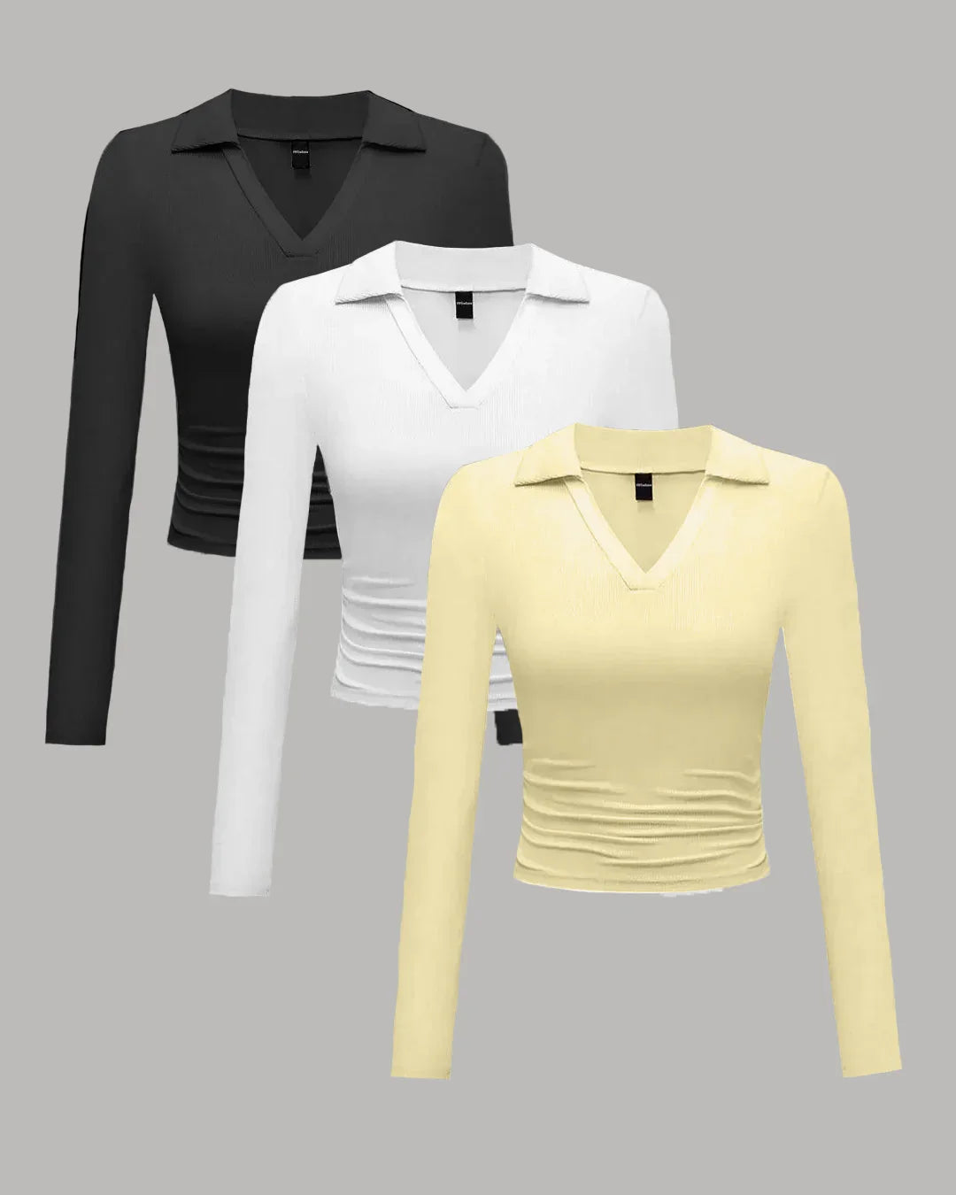 Upgrade your wardrobe essentials with this set of 3 long-sleeved tops featuring a chic V-collar design. Available in classic black, versatile white, and soft vanilla, these pieces bring everyday elegance with a slim fit that pairs easily with anything. Perfect for layering or wearing solo, these long-sleeved tops give you the right mix of comfort and style.