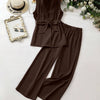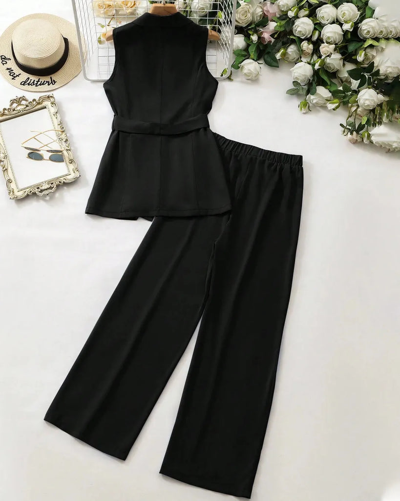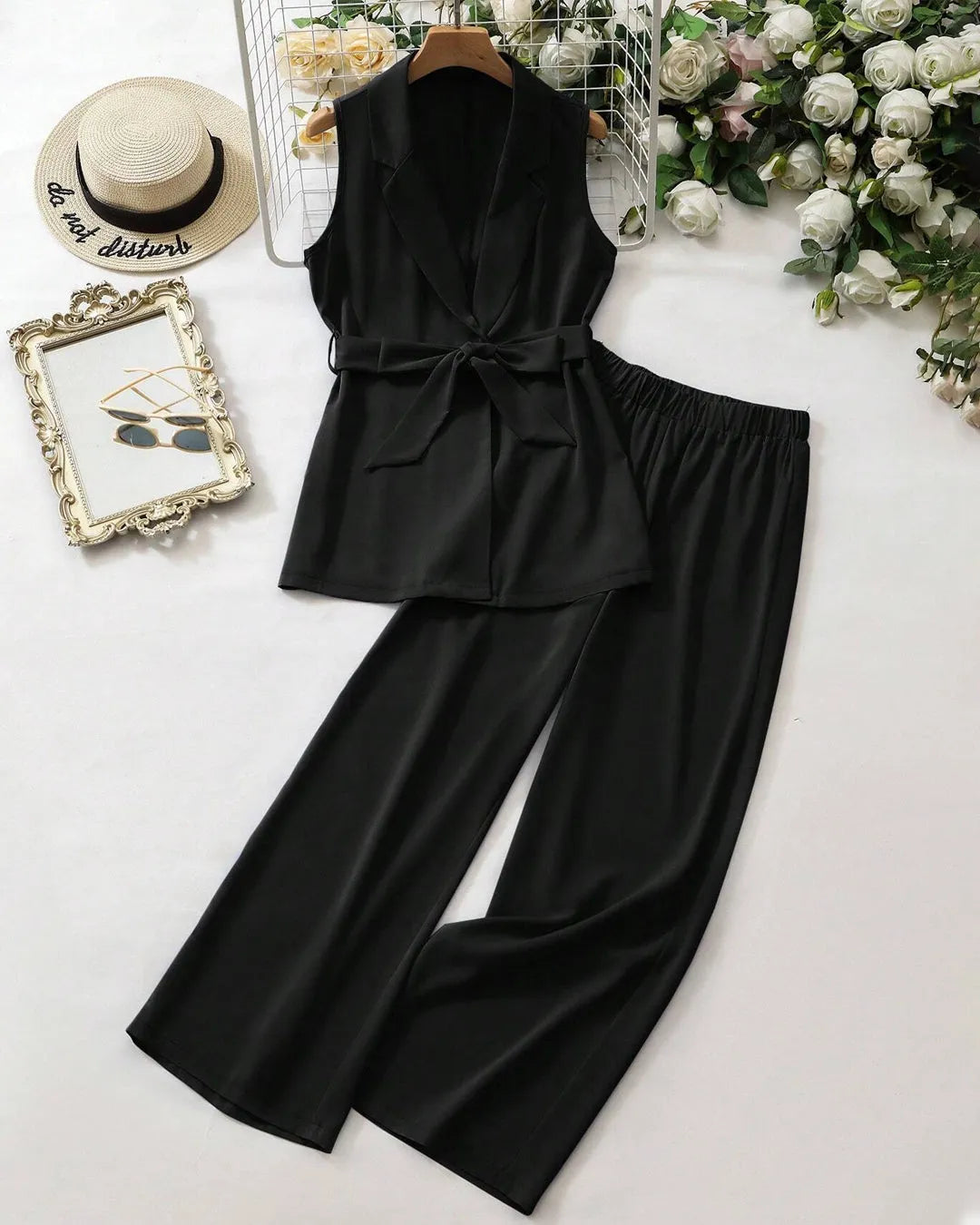 This vest and trouser set blends minimal tailoring with easy comfort. The sleeveless vest features a tie-front detail for adjustable fit, while the relaxed trousers offer effortless movement. A sleek co-ord for everything from office wear to evening dinners.