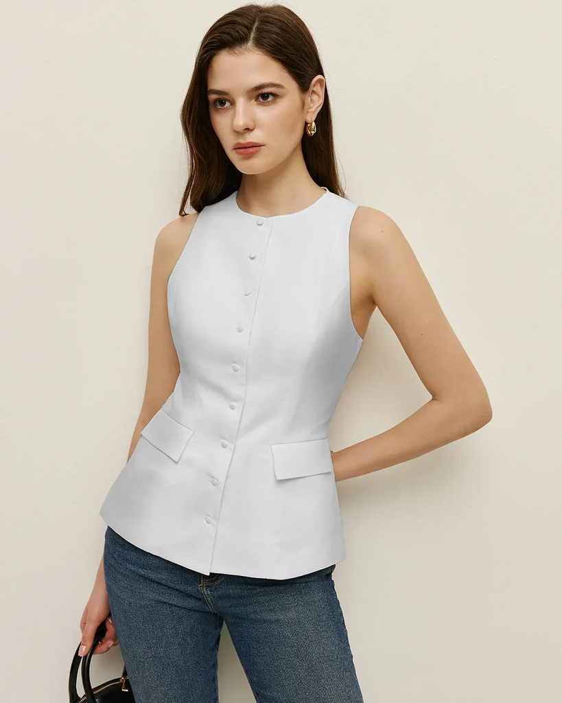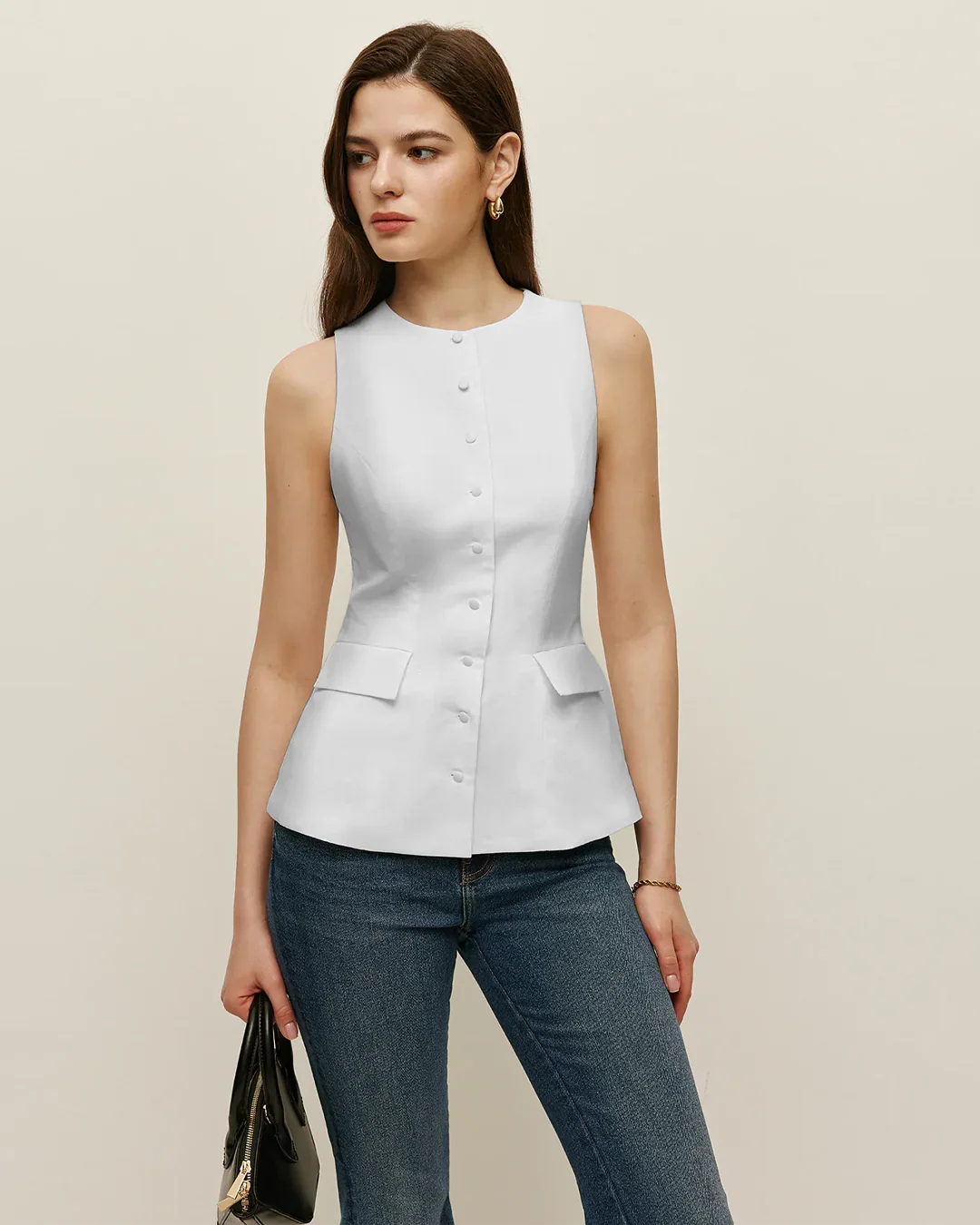 This structured peplum top is tailored to flatter with its sculpted waist and flared hem. Featuring a clean button-down front and subtle flap pockets, it balances elegance with edge. The crisp white tone keeps it minimal yet statement-worthy.