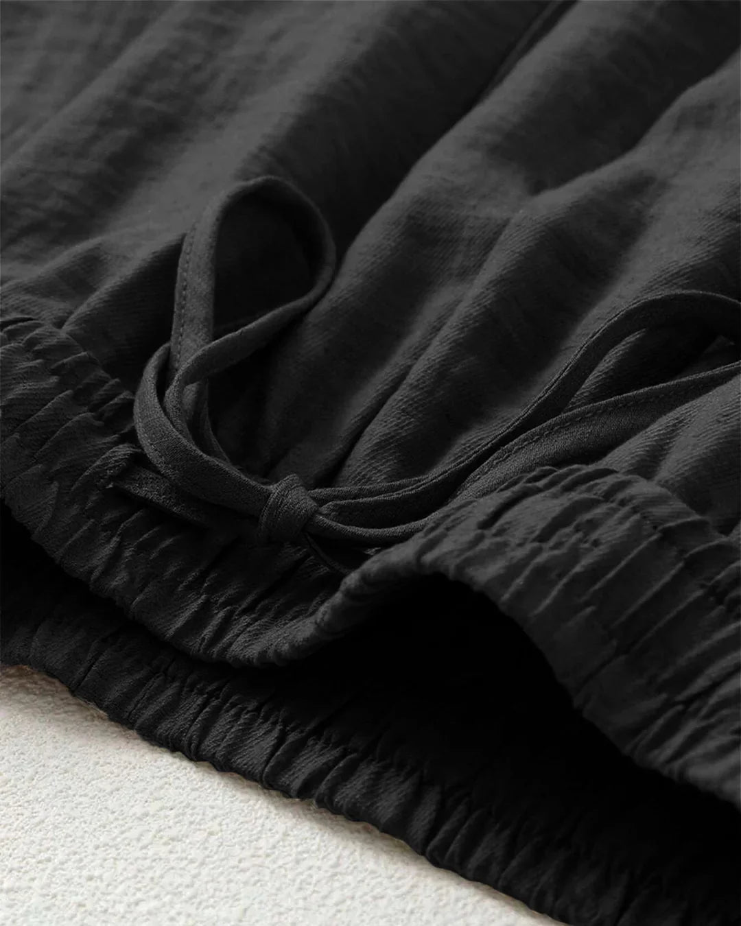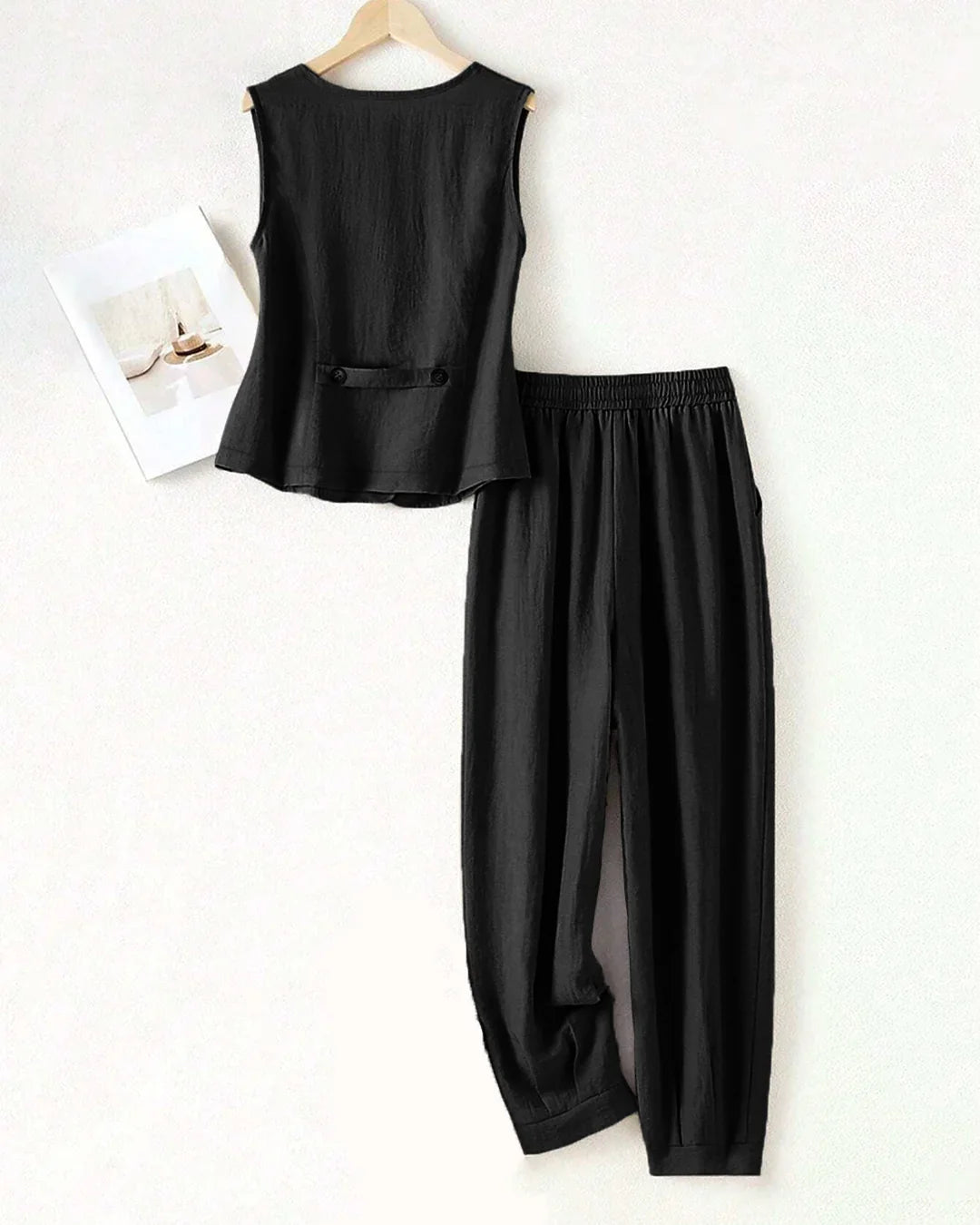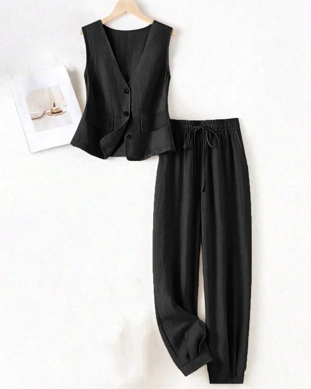 Sleeveless Button Vest & Relaxed Fit Trousers Set in Black