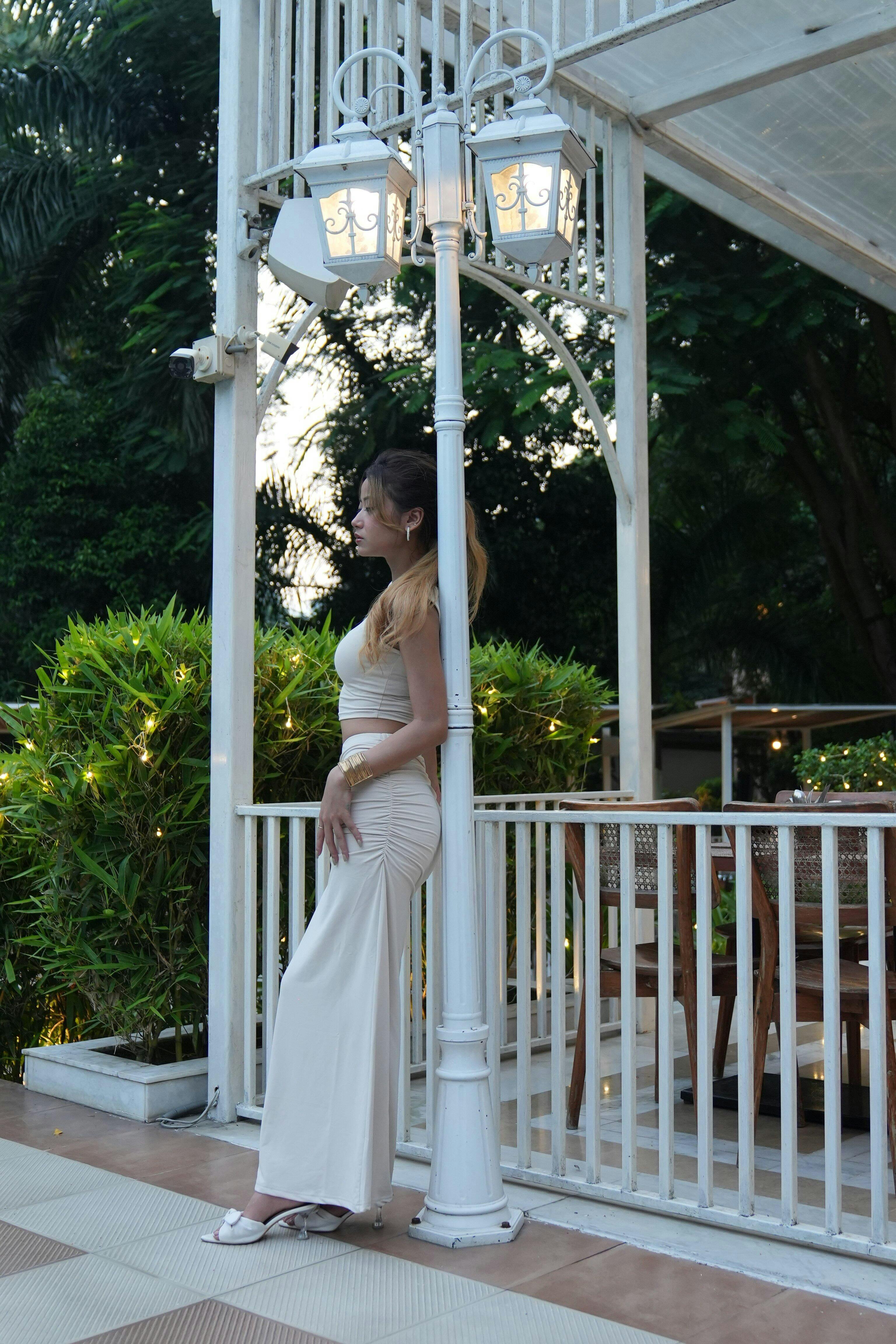 Sleeveless Crop Tank Top & Ruched Maxi Skirt In Off White