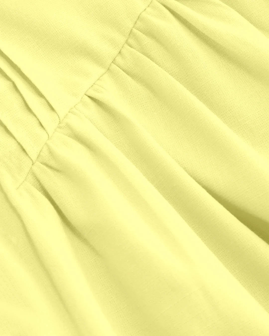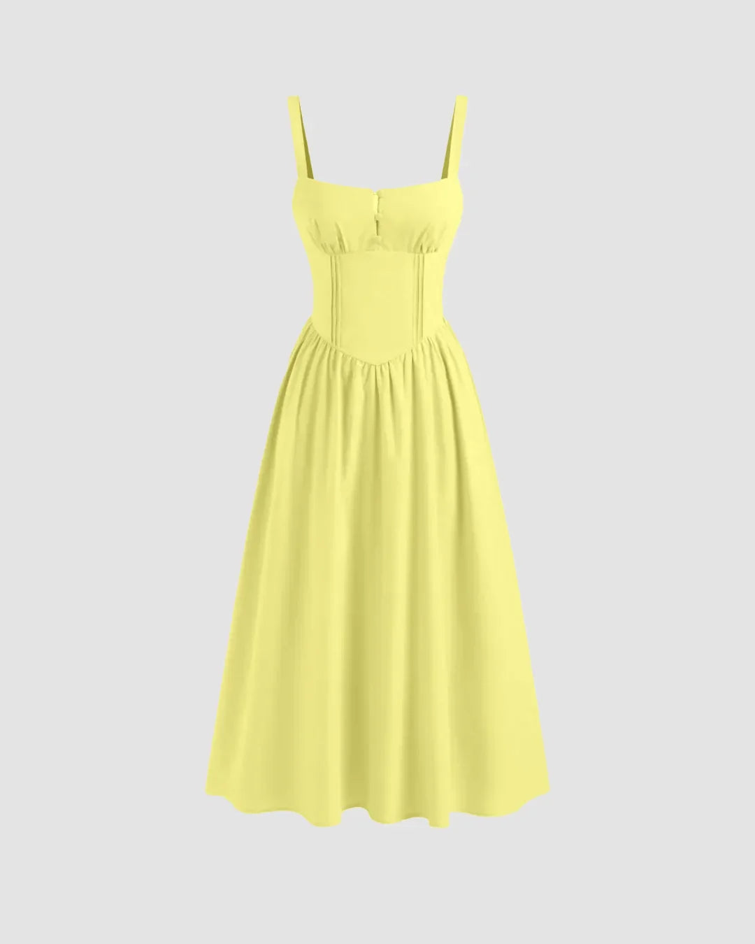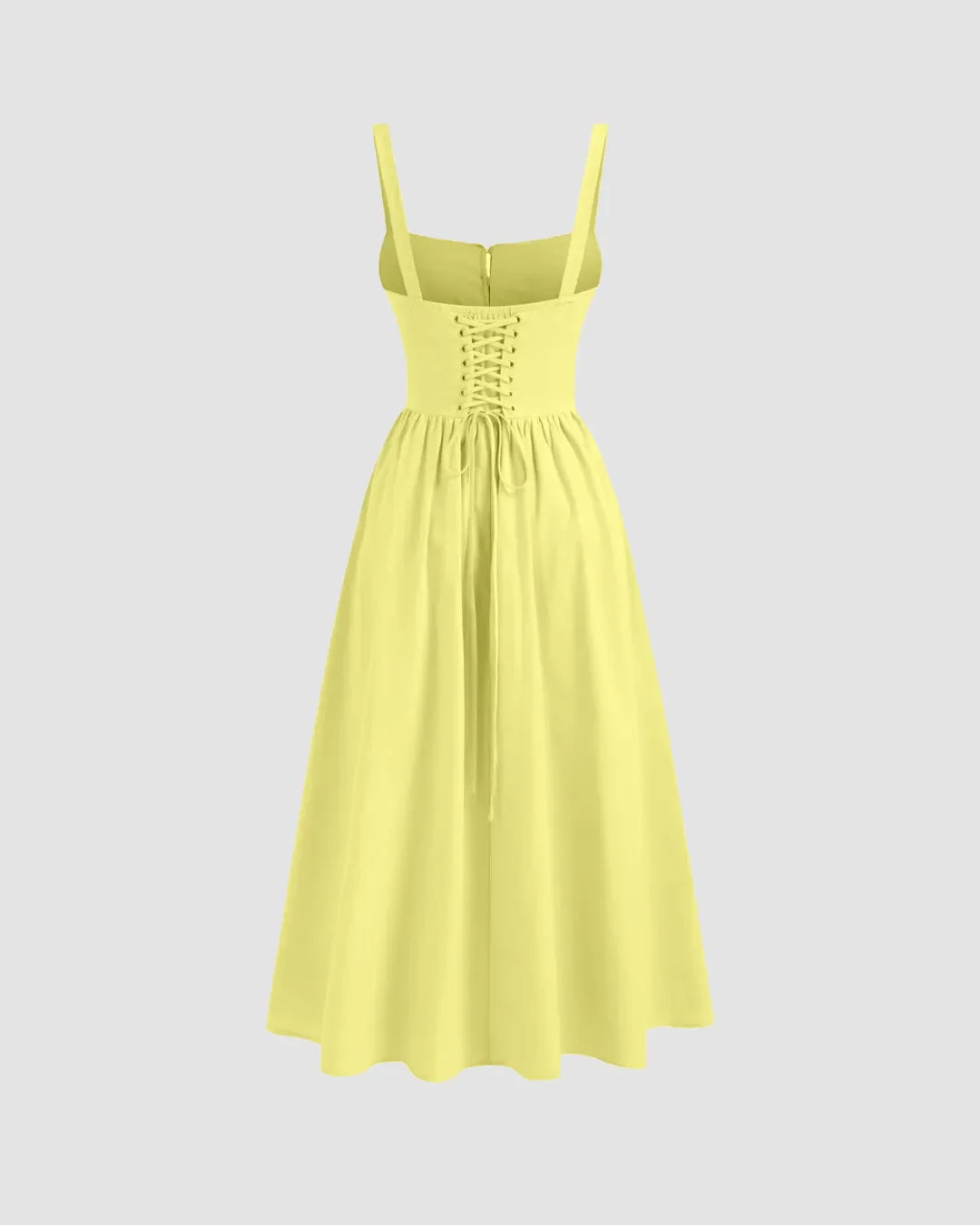 The Sleeveless Tie Strap Midi Dress in Yellow is all about sunny-day elegance. With its corset-inspired bodice and tie straps, it adds a flattering structure while keeping things playful and breezy. The flowing midi length gives this yellow midi dress a feminine charm, perfect for brunch plans, vacations, or casual outings. A yellow midi dress that balances chic design with everyday comfort.