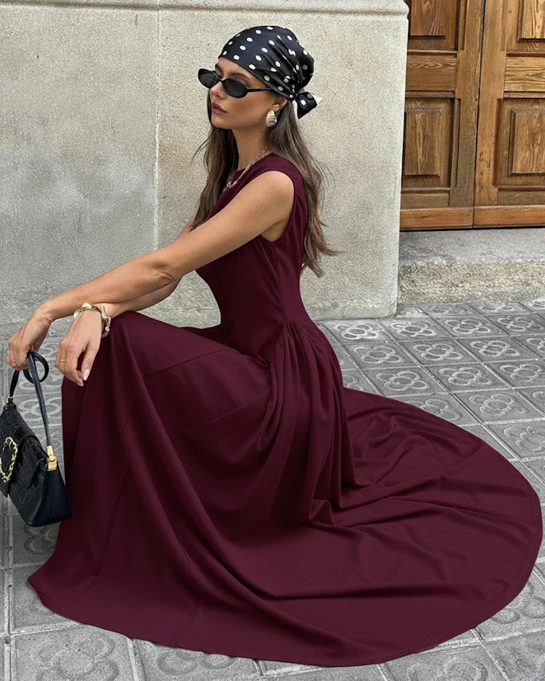 Solid Burgundy Crew Neck Fit & Flare Maxi Dress