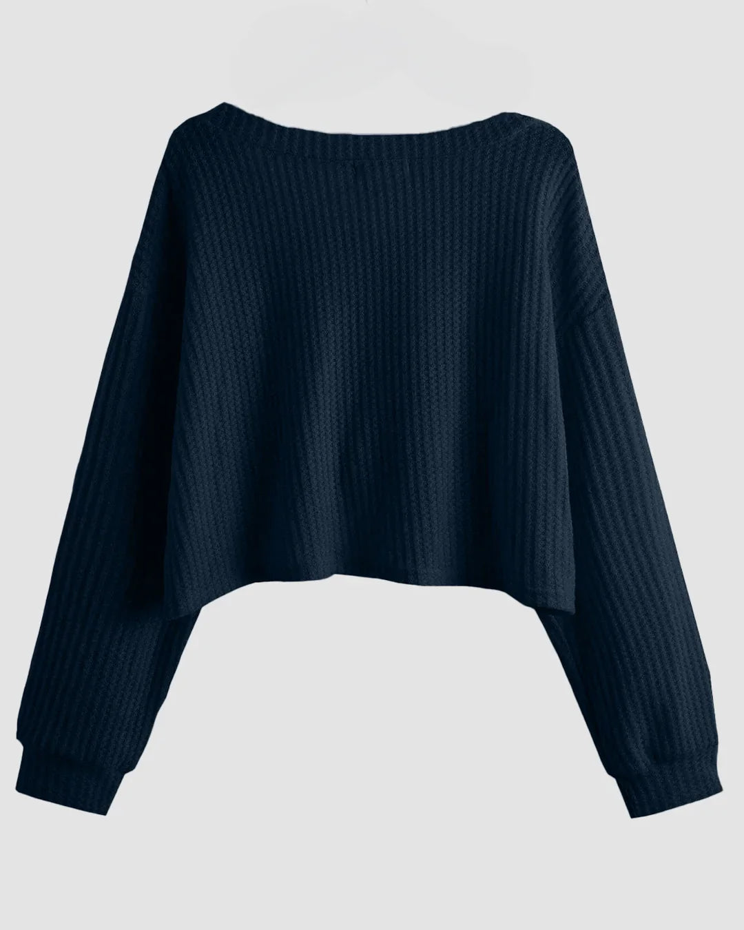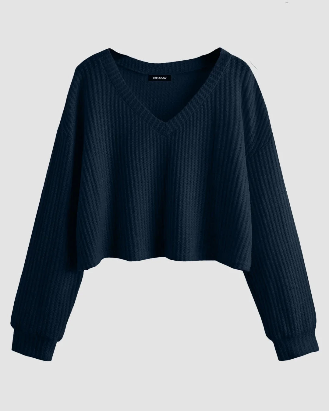 This Long Sleeve Casual Sweater in Indigo brings a soft, relaxed feel with its loose V-neckline and easy drop-shoulder fit. The textured knit adds a cozy touch, while the cropped length keeps the look modern and lightweight. Designed for everyday comfort, the Long Sleeve Casual Sweater in Indigo feels soft against the skin and gives a naturally laid-back vibe that works for casual outings or stay-in days.