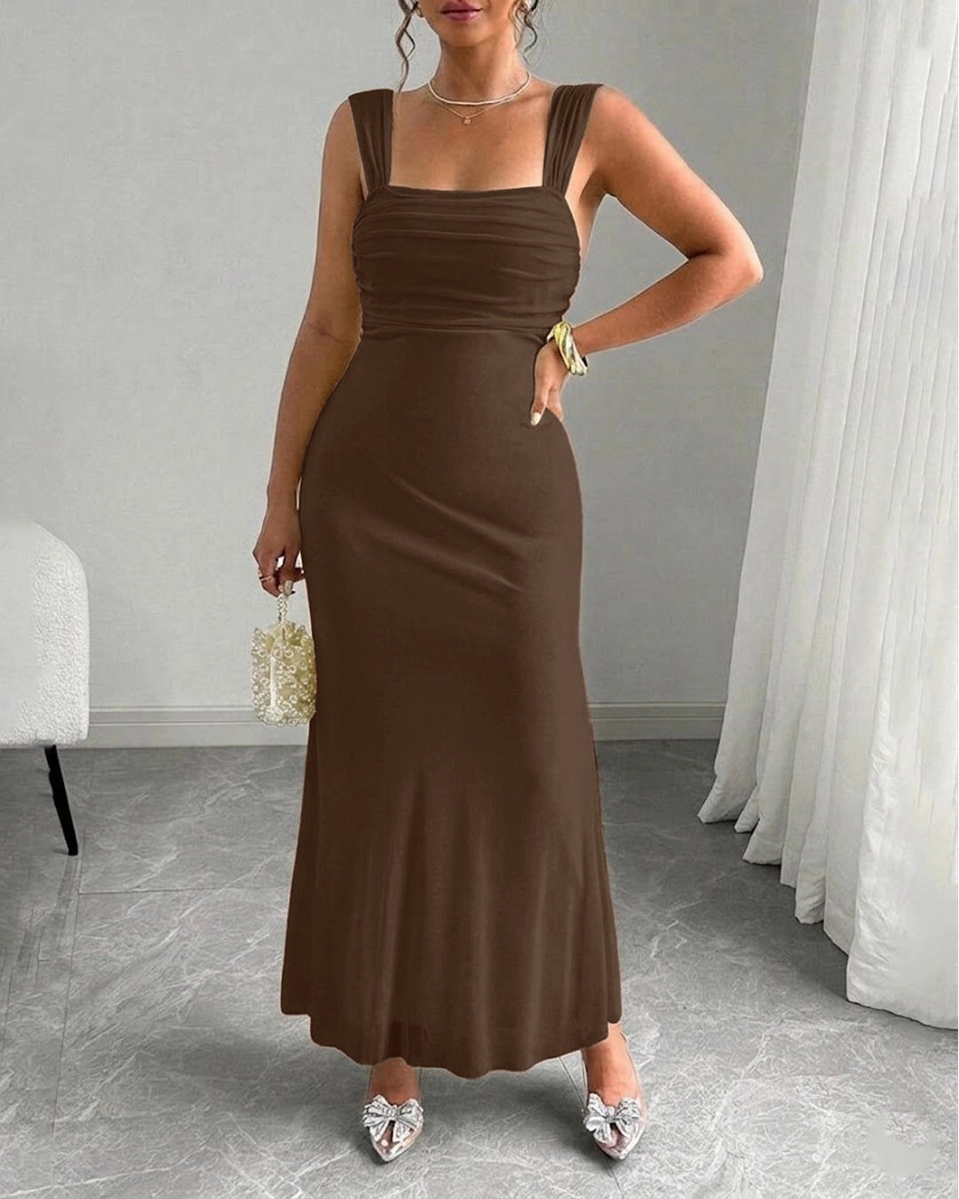 This Strap Ruched Backless Knot Tie Dress Curve & Plus in Coco Brown brings a sleek, flattering vibe with its sculpted silhouette and soft detailing. Designed with shoulder straps and ruched texture across the bodice, it enhances your shape while keeping the look smooth and refined. The backless design with a knot tie detail adds a bold, stylish edge, while the flowy skirt keeps it balanced and elegant. Made from polyester and spandex, it feels soft with a comfortable stretch that fits beautifully. This ruched backless knot tie dress in coco brown adds warmth and effortless style.