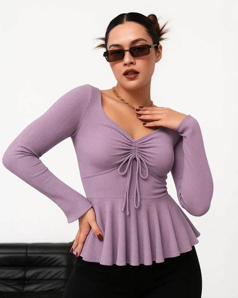 Introducing our V-Neck Drawstring Long Sleeve Top in Lilac. This long sleeve top brings a soft romantic vibe with a touch of playful flare. The ruched drawstring front and flared hemline shape your silhouette in all the right ways while keeping it comfy.