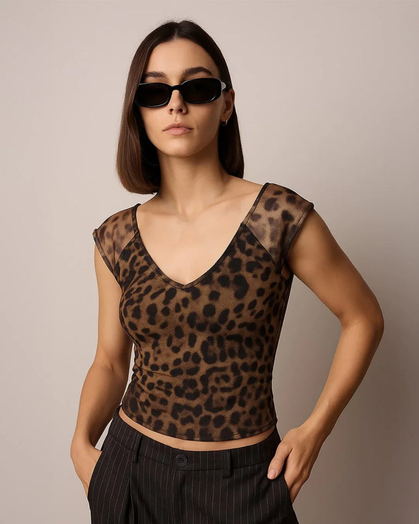 Introducing our V-neck Leopard Halter Short Sleeve Tee.
