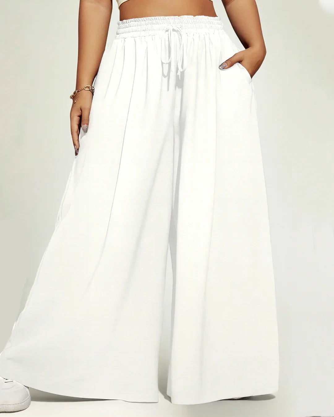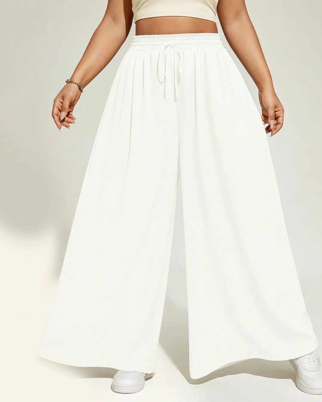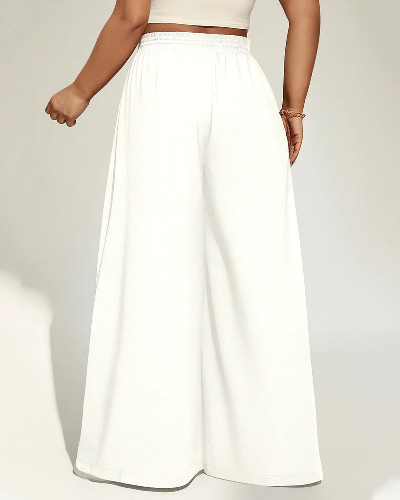 The White High-Rise Drawstring Flare Leg Pants Curve & Plus are the ultimate mix of comfort and cool-girl style. The high-rise elastic waistband gives a secure yet relaxed fit, while the drawstring adds an easy, adjustable touch. Made from a soft blend of polyester and cotton, these flare leg pants feel breathable and light, making them perfect for everyday wear. The wide-leg silhouette adds flow and shape, giving your look an effortless, breezy vibe.